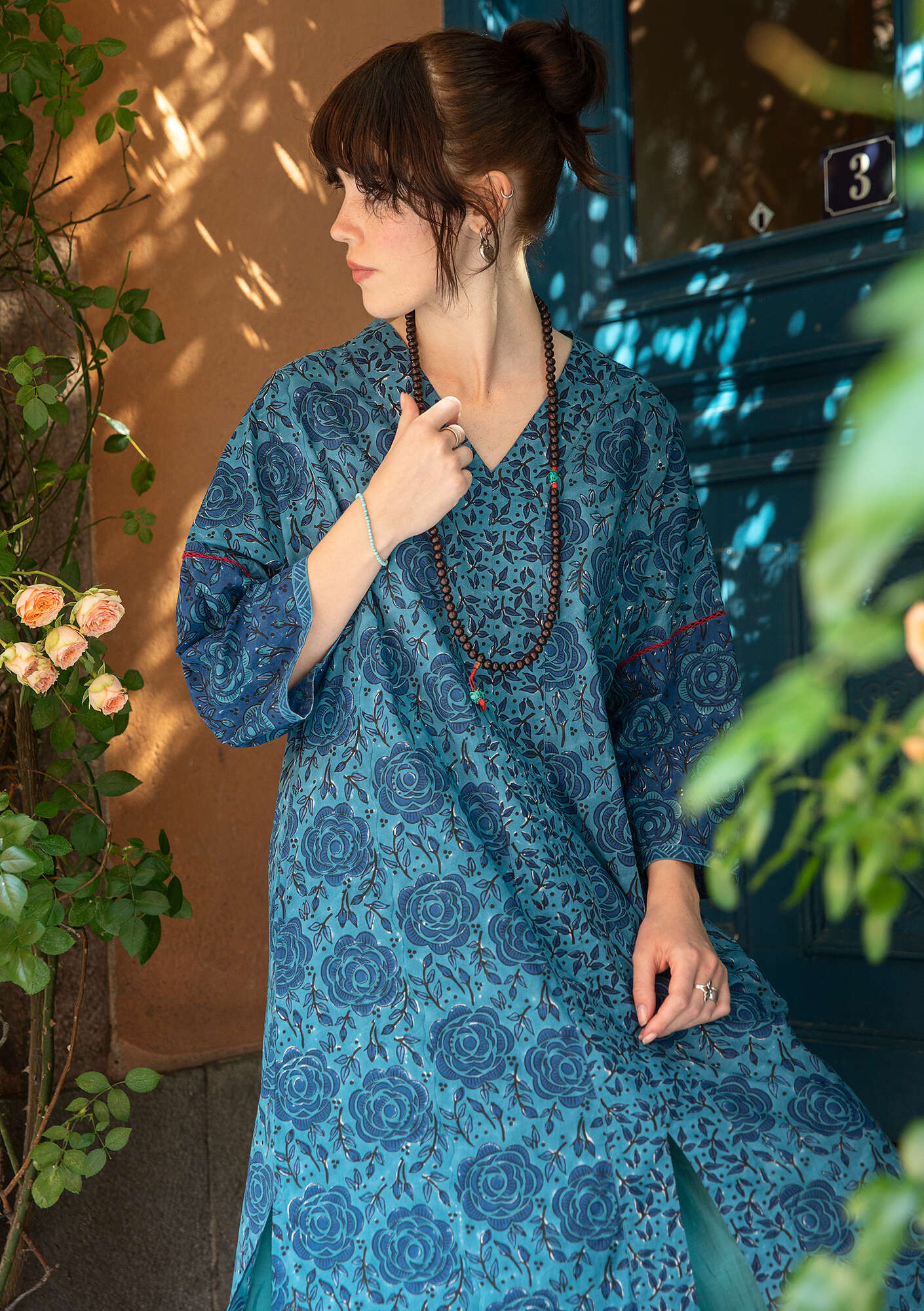 100% cotton. The cotton is certified organic. The garment is block-printed by hand. Delicate wash at 30°. Iron on medium heat. 2-3% shrinkage. Made in Bagru, India.