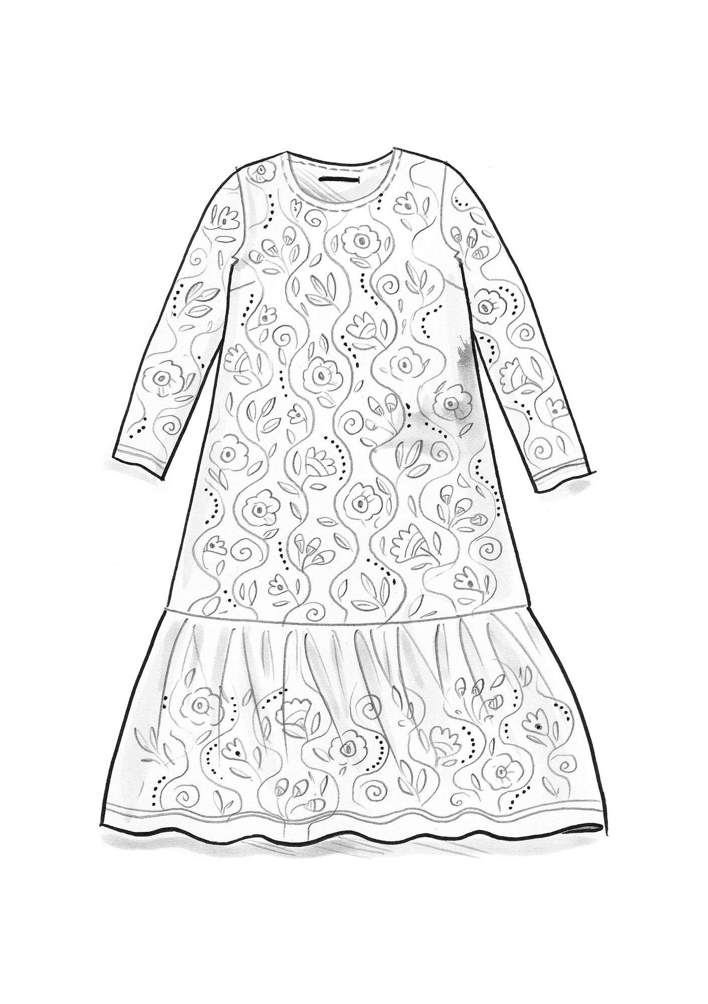 • Jersey dress adorned with a profusion of leaves and flowers. It features a round neckline, full-length sleeves and the skirt is finished with a gathered tier.