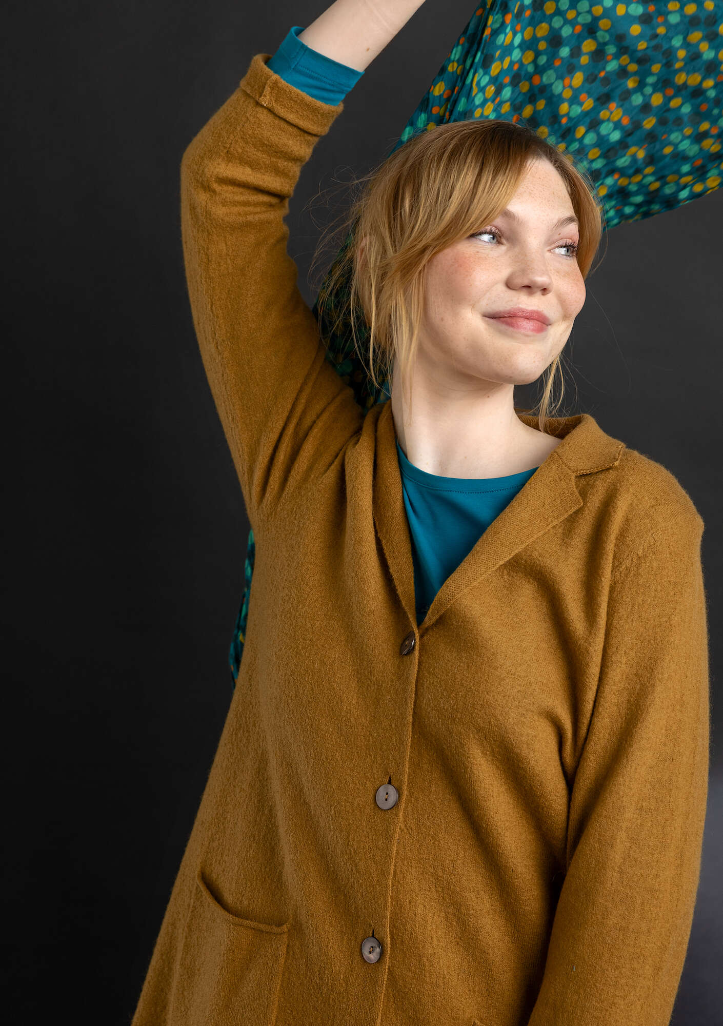 100 wool. 50% merino wool. The wool is mulesing-free and certified organic. The dyeing process is certified as compliant with environmental standards. Even the finest of wool fabrics may show some pilling after repeated wear. Carefully remove any pilling by hand. We recommend airing the garment outdoors or steaming with an iron. If absolutely necessary, handwash at 30° or machine wash on the handwash cycle. Use a detergent specifically for wool. Reshape the garment while damp and dry flat. Store horizontally. 4-5% shrinkage. Made in Dongguan, China.