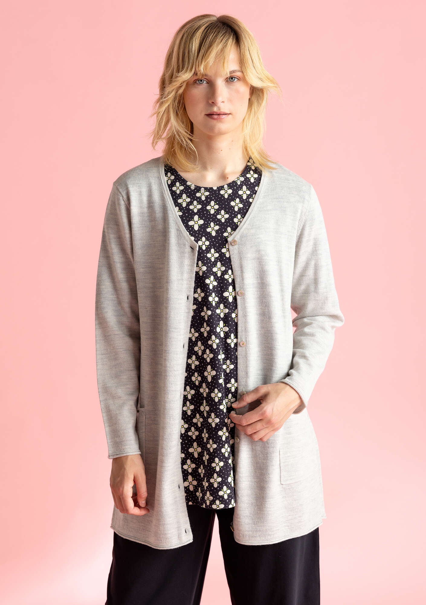 • V-neck cardigan with full-length sleeves. Shaped at the top, flaring gently towards the hem. Neat rolled edges. Patch pockets and dyed mother-of-pearl buttons. Colour accent details on the inside.