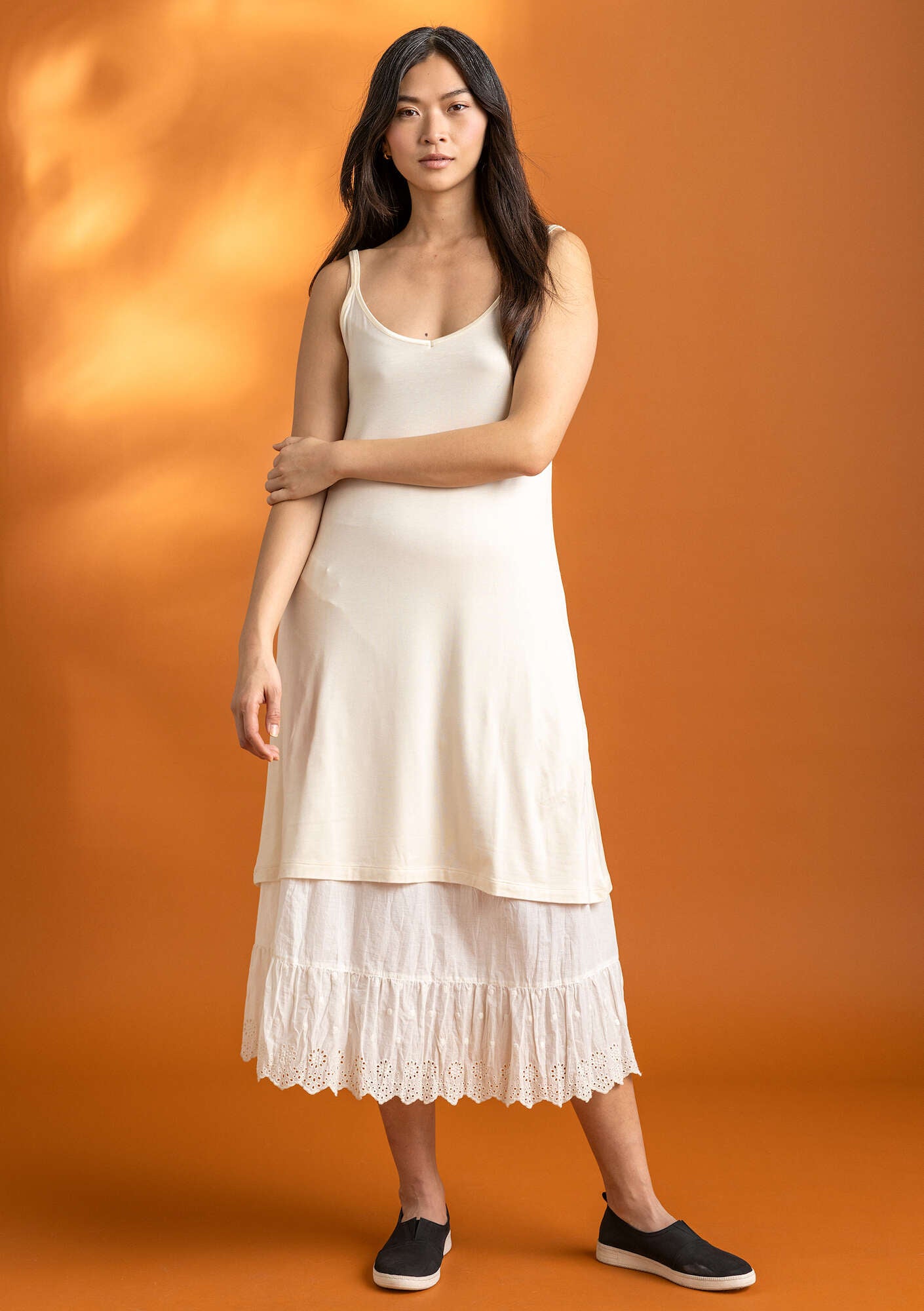 Sleeveless dress crafted from a soft, flowy fabric. V-neckline and a slightly rounded hem at the back. Narrow, adjustable shoulder straps. Ideal as a slip for dresses too.
