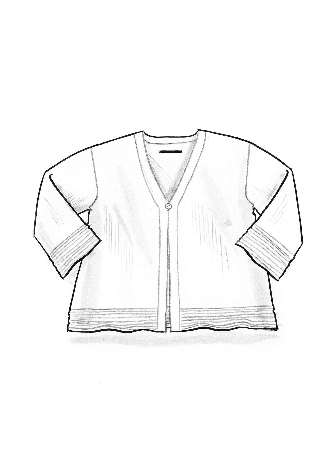 A breezy, relaxed-style cardigan. V-neck and bracelet length sleeves. Mother-of-pearl button with loop at the front. Featuring fine textured borders at the hem and cuffs.