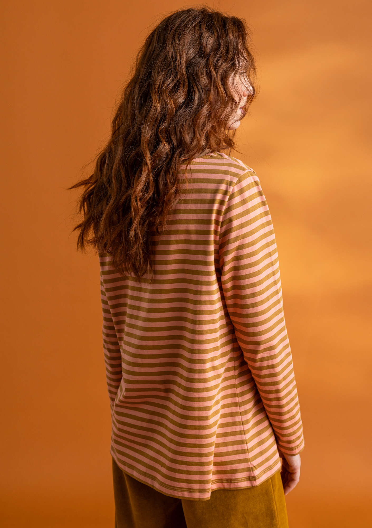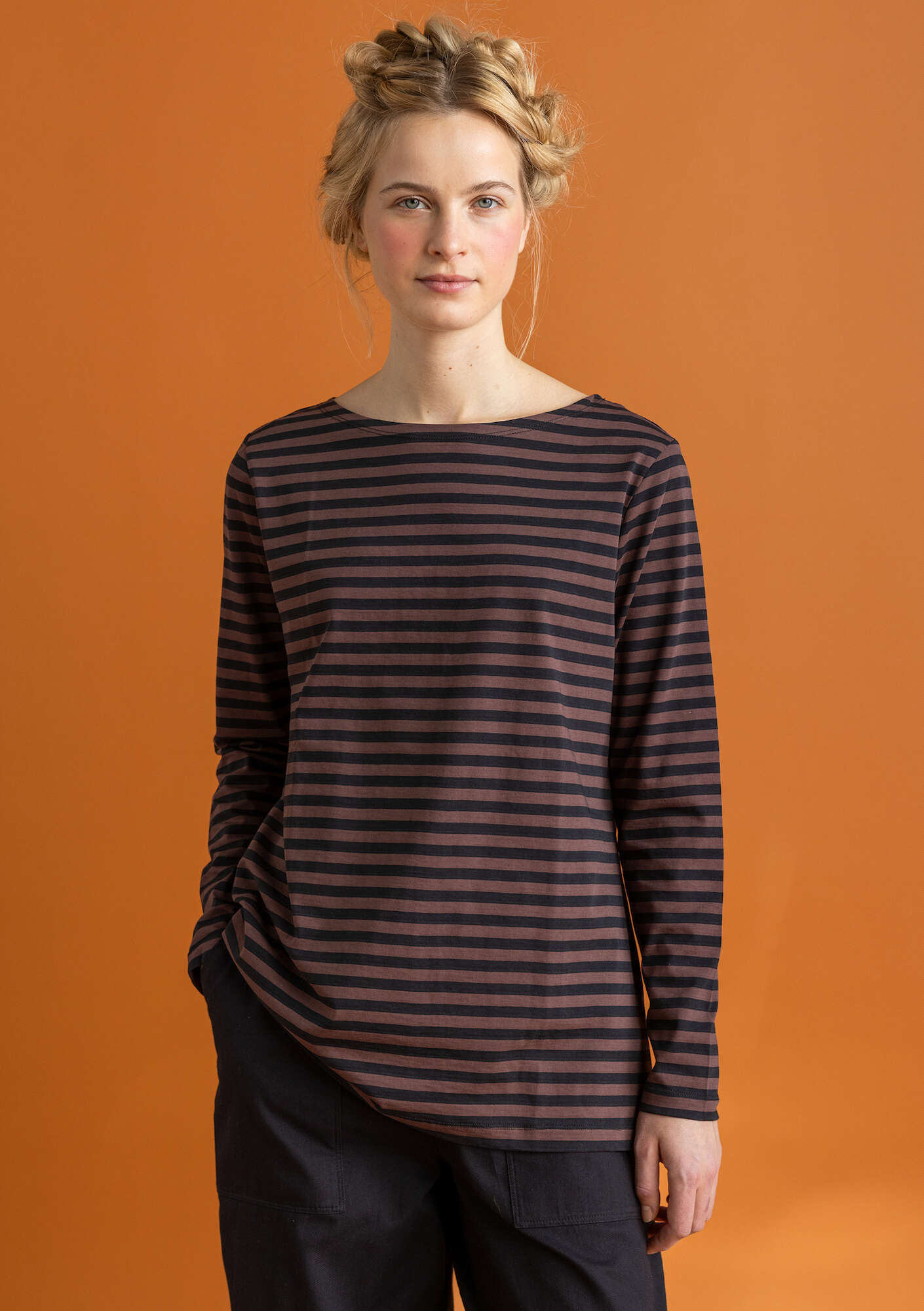 • A yarn-dyed stripe and a simple silhouette with full-length sleeves. A gentle boat neckline with double needle stitching around the edge.