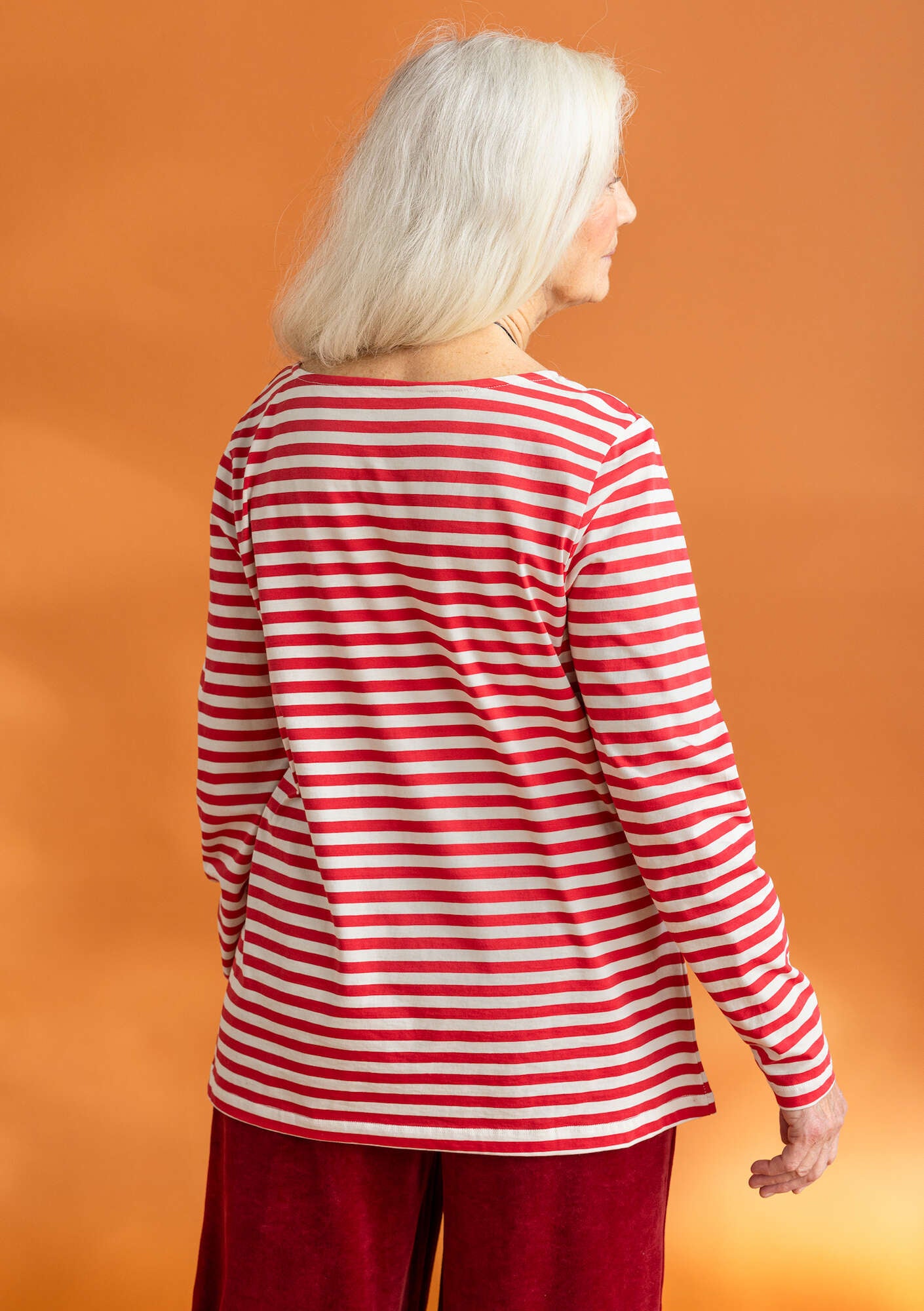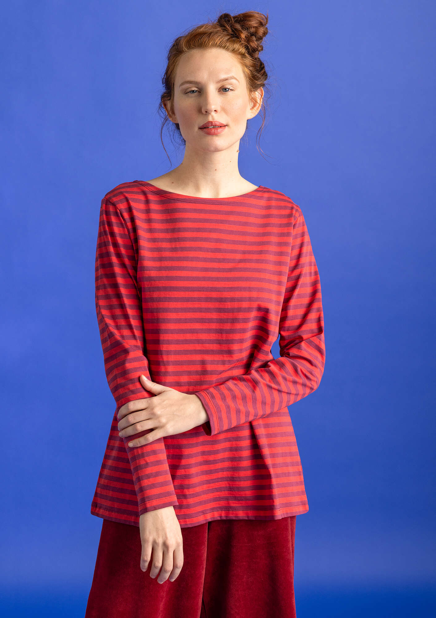 A yarn-dyed stripe and a simple silhouette with full-length sleeves. A gentle boat neckline with double needle stitching around the edge.