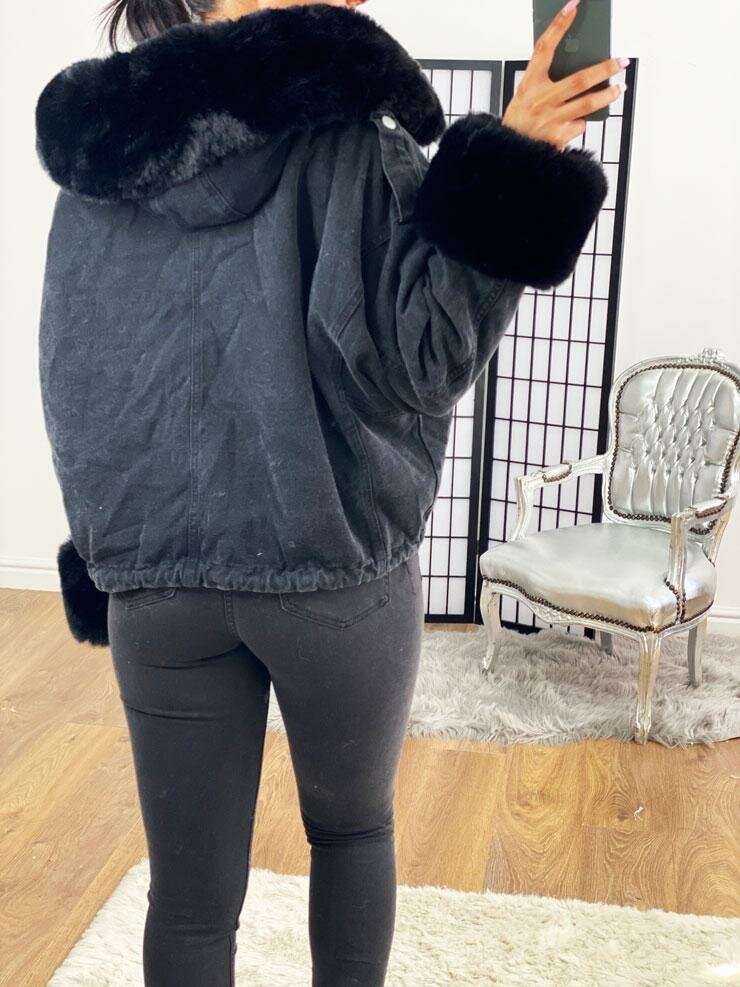 Carolana Black Denim Black Faux Fur Hooded Coat