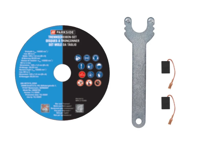Accessoires inclus : 1 disque à tronçonner métallique Ø 125 mm, 1 clé de serrage, 1 set de balais de charbon de rechange