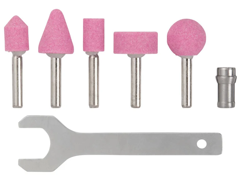 Accessoires inclus: 2 pinces de serrage 3,2 mm et 6 mm (prémontées), jeu de 5 meules sur tige, 1 clé de montage