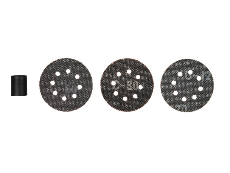 Accessoires inclus : Adaptateur pour l'aspiration externe des poussières, 3 grilles de ponçage avec fixation auto-agrippante (grain 60, 80, 120)