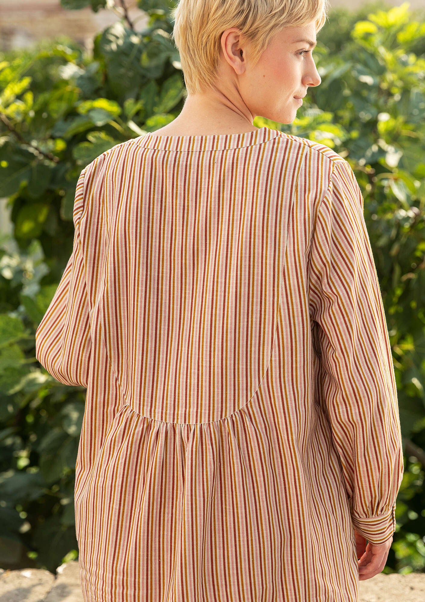 Shirt dress in a choice of two printed designs. Button-through with a curved hem. It has a shaped panel on the front of the bodice, long sleeves with buttoned cuffs and gathers at the yoke on the back. A neat mandarin collar and fabric-covered buttons.