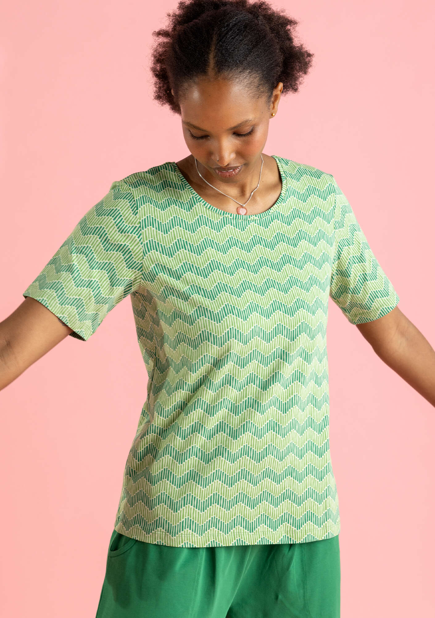 • A simple T-shirt style with a round neck. Choose from a cute little zigzag design and a selection of solid colours.