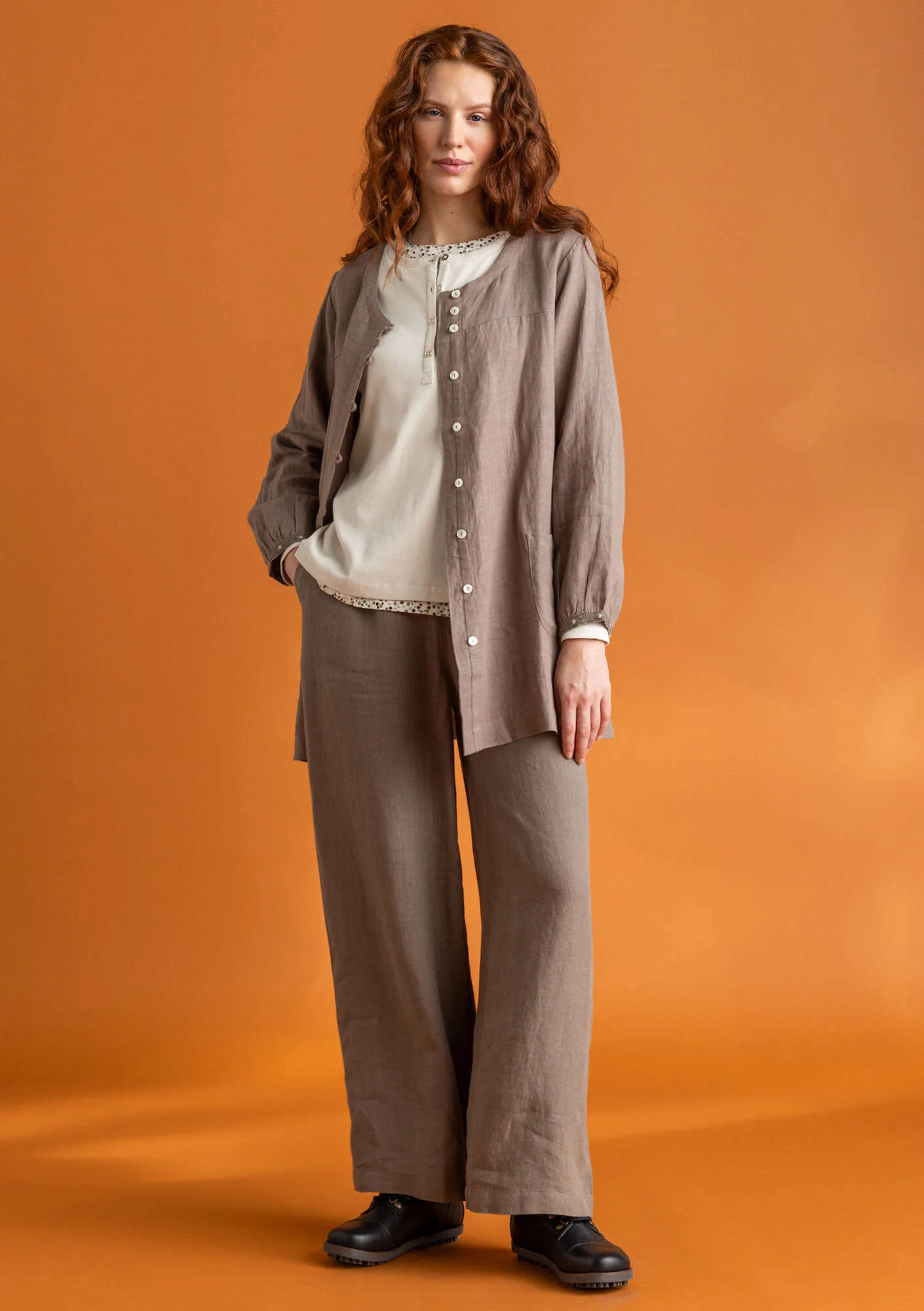 - 100% linen. The linen is made from dew-retted flax. Dew-retting is an environmentally-friendly, natural process that uses minimal water, no chemicals, and lets the sun and dew do the work. Every stage of the manufacturing chain is certified as compliant with environmental standards. Delicate wash at 40u00b0. Iron on medium heat. 2-3% shrinkage. Made in Kundli, India.