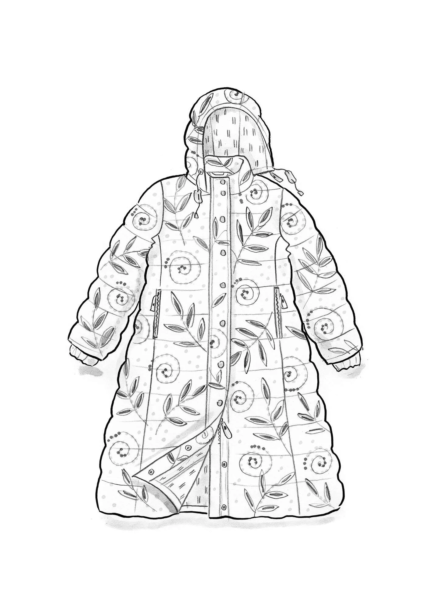 - Baffle-quilted down coat with a beautiful print pattern inside and out. With both zip and metal button closure. Detachable hood with drawstring and cord locks. Inset side zip pockets plus an inside zip pocket. The sleeves are finished with shaped cuffs.