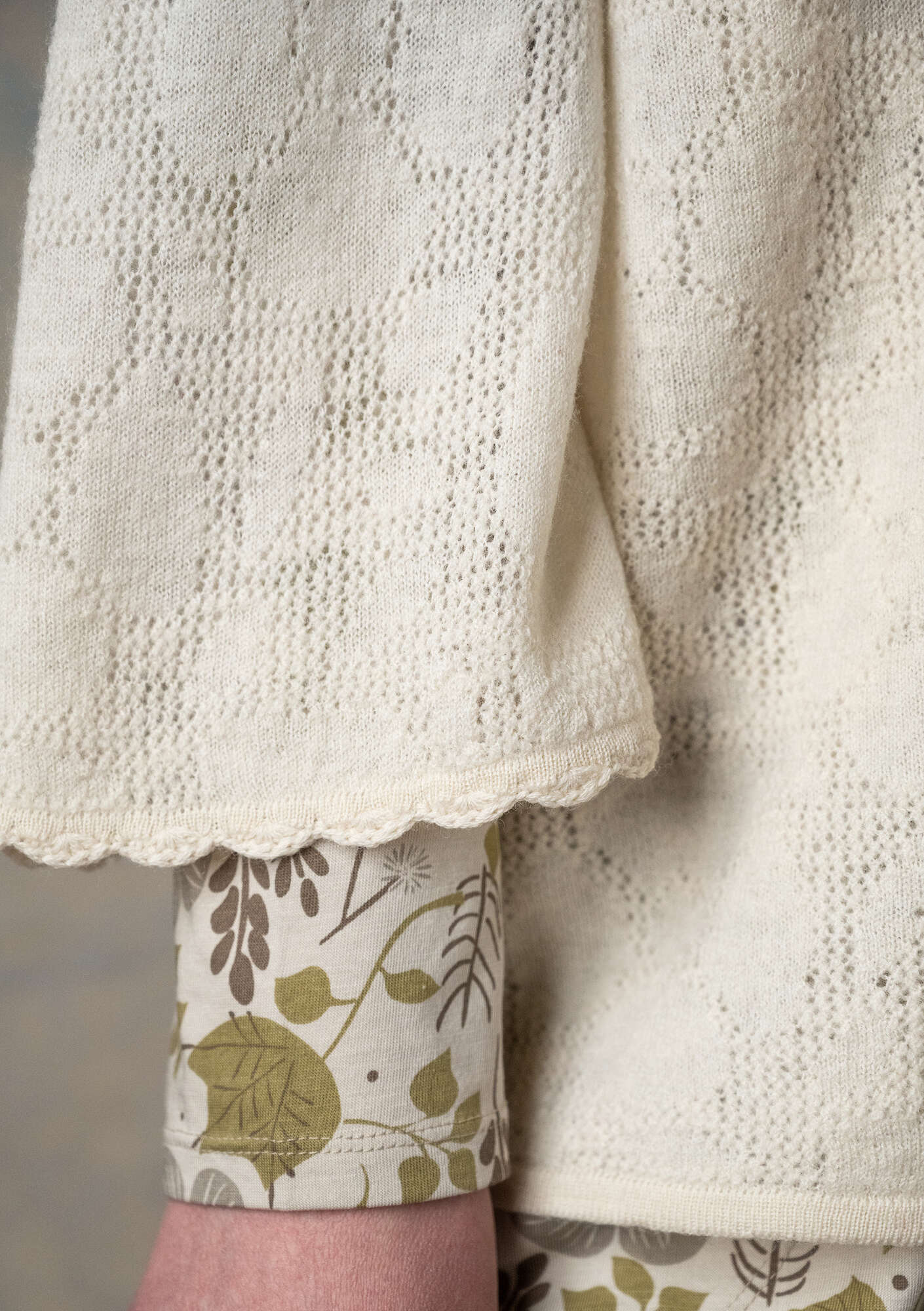 - Pointelle cardigan knitted in soft merino wool and slightly felted. Featuring three-quarter trumpet sleeves with scalloped edge. Rounded neckline with small bobbles. Mother-of-pearl buttons in matching shades.