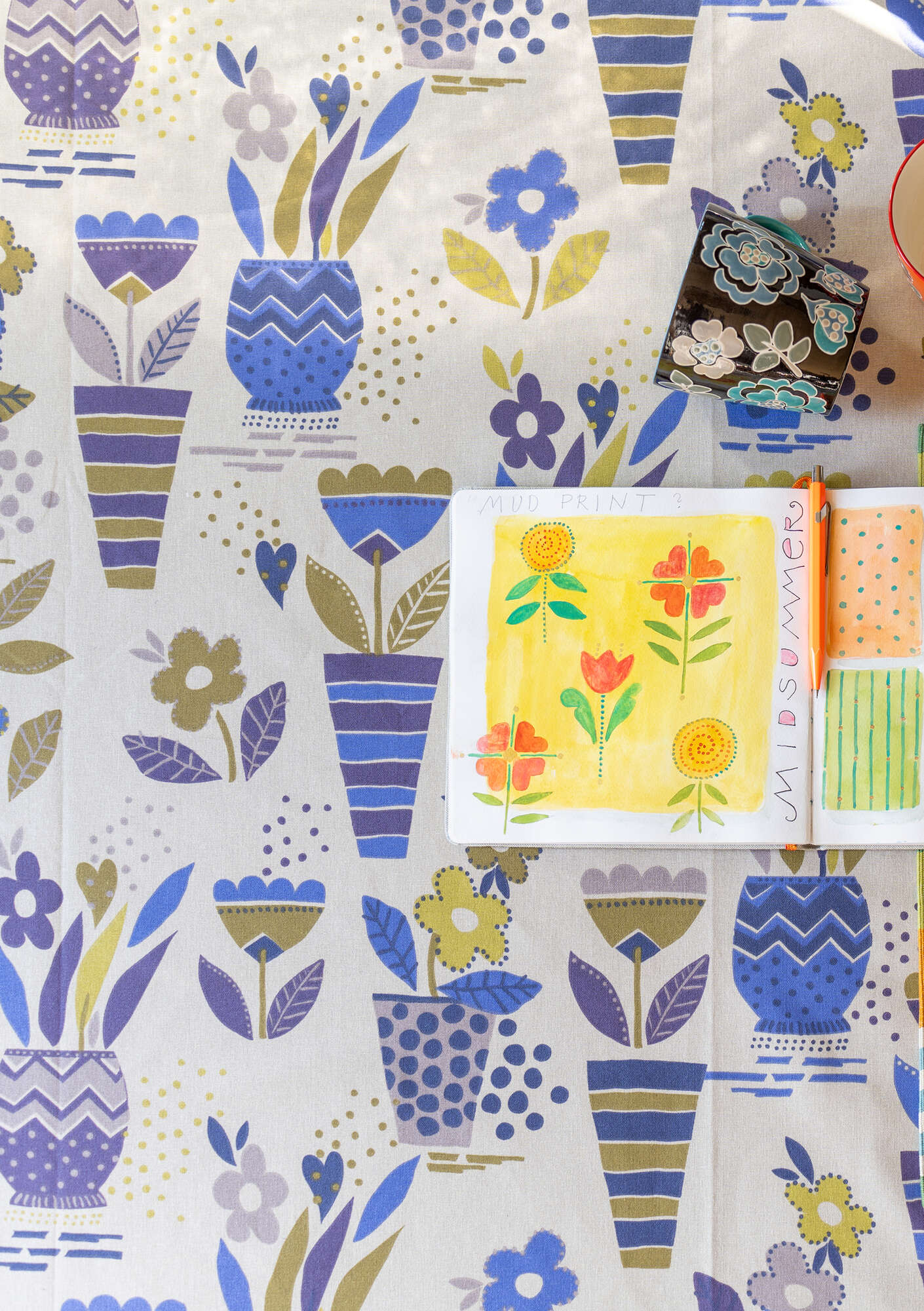 “Flower pots” organic cotton waxed tablecloth