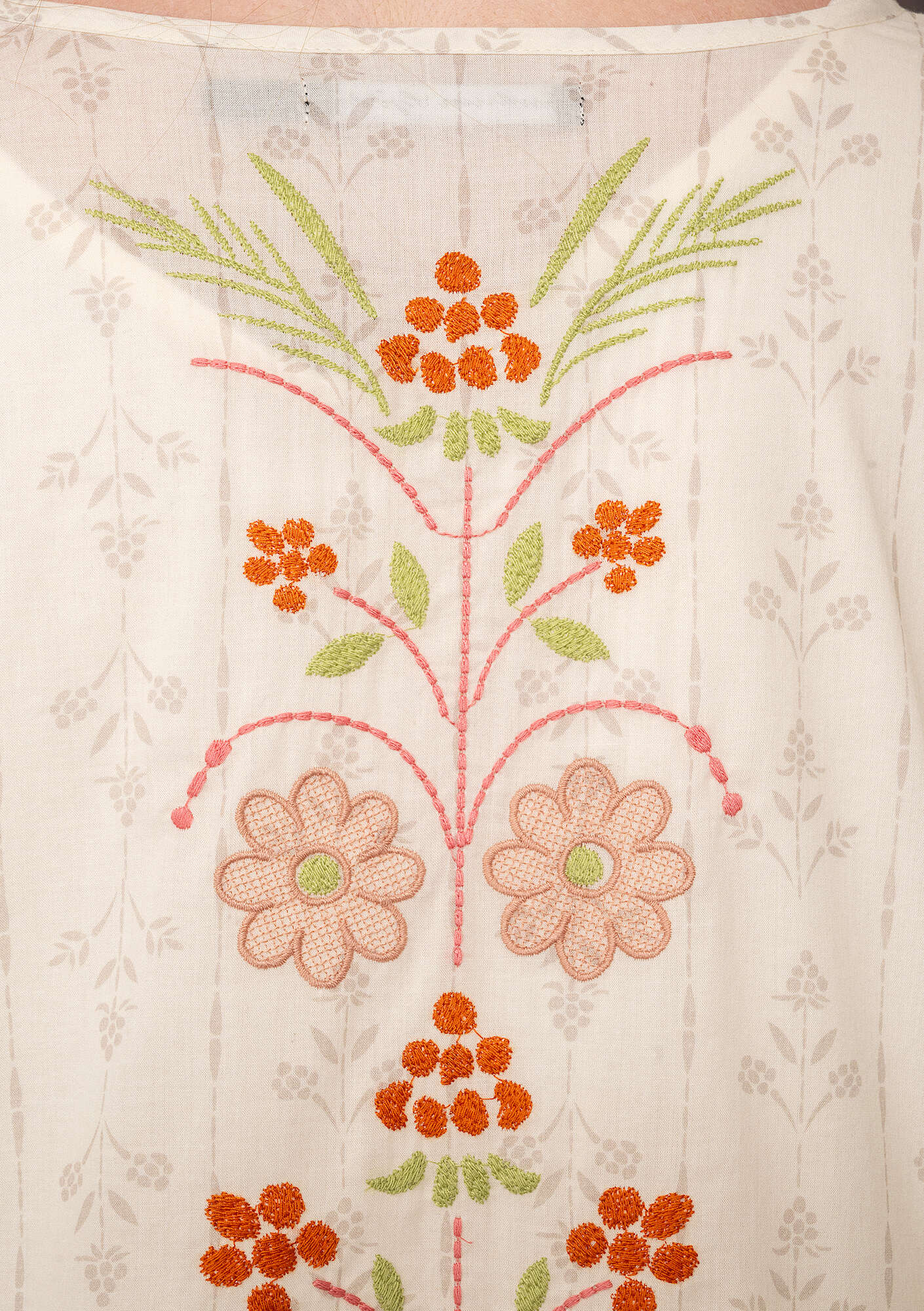 • Printed tunic in a button-through style with side pockets. Seamed waist and front yoke. Pintucks at the hem and on the sleeves. Embroidered detailing on both the front and back. Round neck. The sleeves puff out half way down and are finished with tie details. Fabric loops and mother-of-pearl buttons.