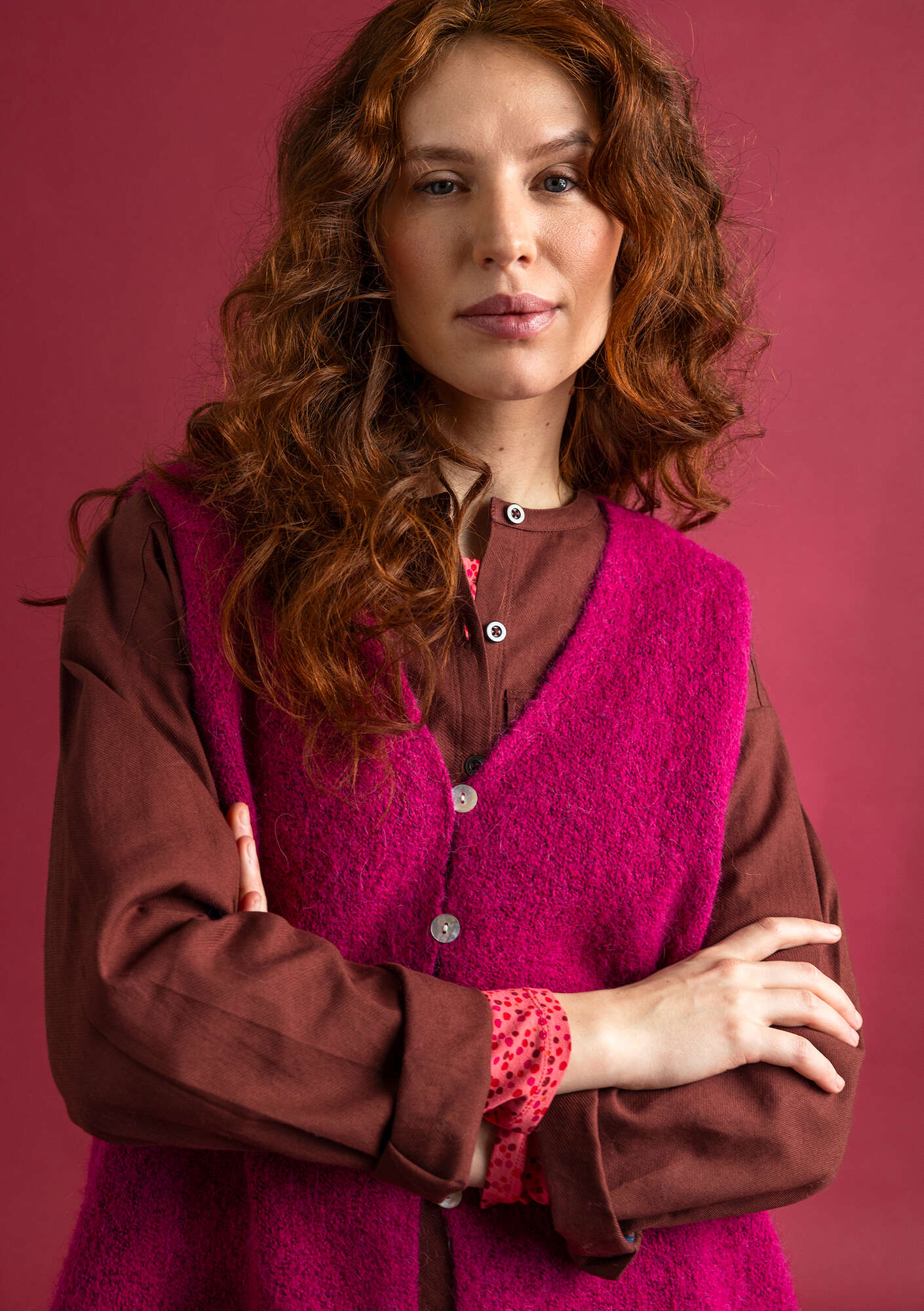 - A lovely longline waistcoat. Knitted in our soft and slightly hairy melange yarn. Fastens at the front with mother-of-pearl buttons and crocheted loops. Features side slits.