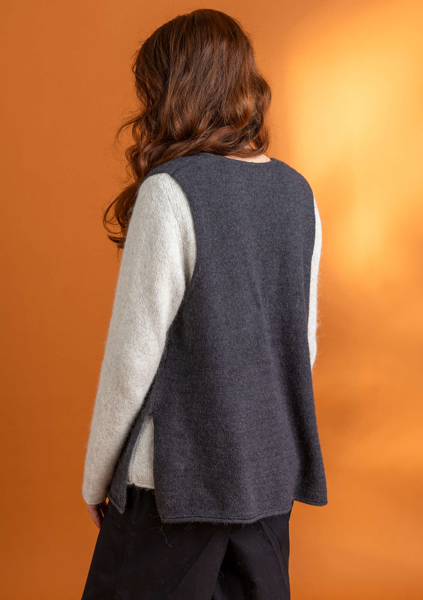 - A lovely longline waistcoat. Knitted in our soft and slightly hairy melange yarn. Fastens at the front with mother-of-pearl buttons and crocheted loops. Features side slits.