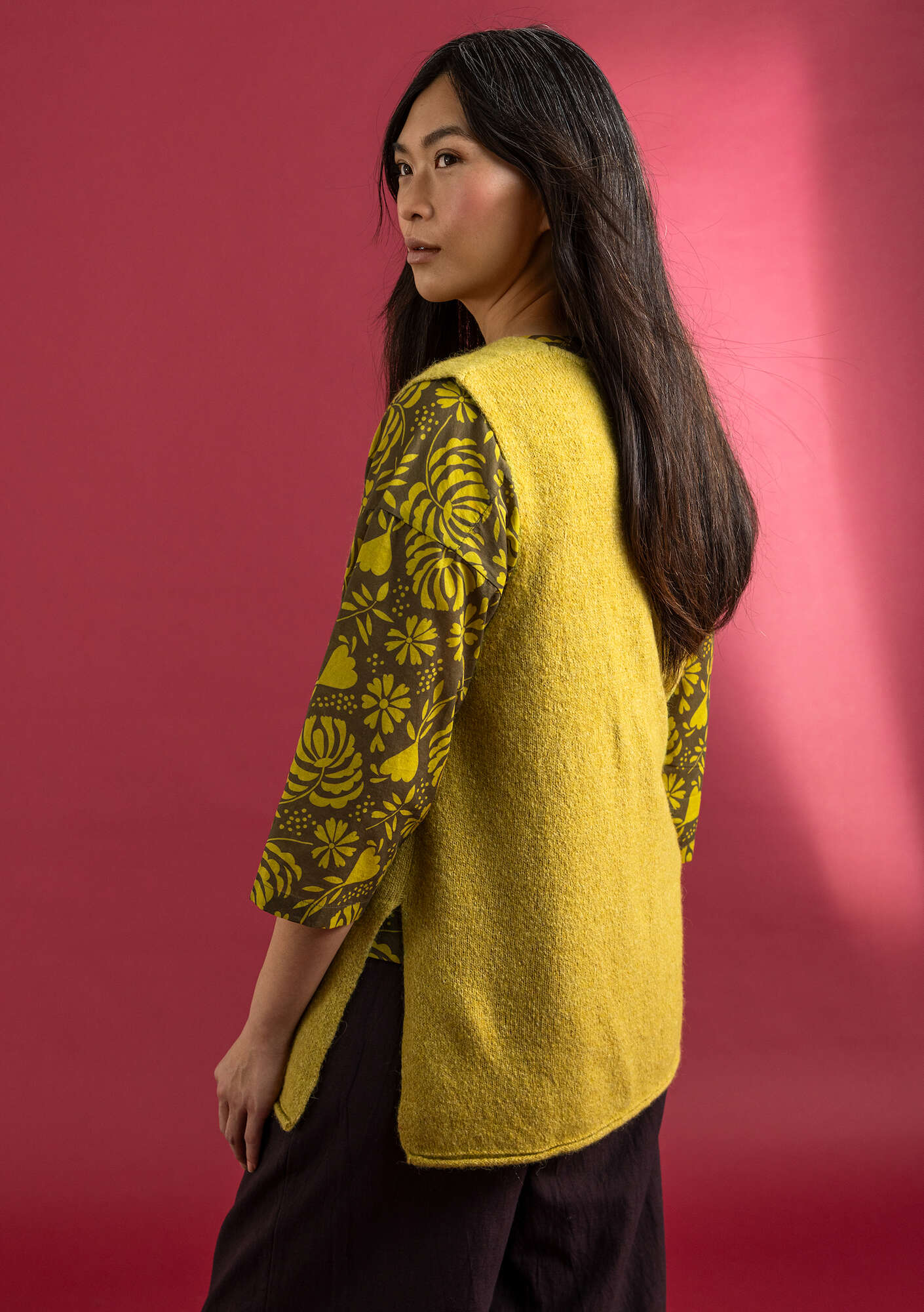• A lovely longline waistcoat. Knitted in our soft and slightly hairy melange yarn. Fastens at the front with mother-of-pearl buttons and crocheted loops. Features side slits.