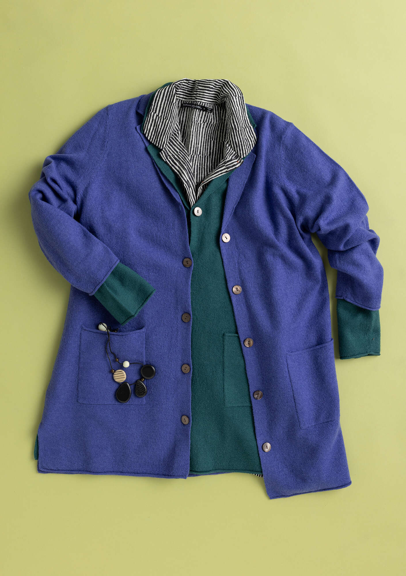 100% wool. The wool is non-mulesed and certified organic. The dyeing process is certified as compliant with environmental standards. Even the finest of wool fabrics may show some pilling after repeated wear. Carefully remove any pilling by hand. We recommend airing the garment outdoors or steaming with an iron. If absolutely necessary, hand wash at 30° or machine wash on the wool cycle. Use a detergent specifically for wool. Reshape the garment while damp and dry flat. Store horizontally. 4-5% shrinkage. Made in Dongguan, China.