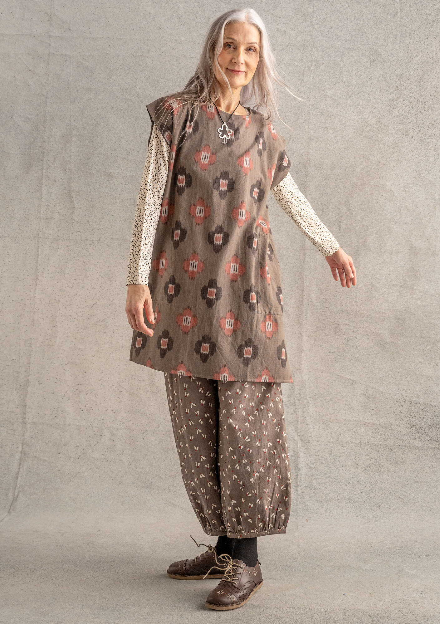 - 100% cotton. The cotton is certified organic. This garment is dyed with vegetable dyes and block-printed by hand. The blue colorway is dyed with indigo, the green with indigo and pomegranate, and the brown with myrobalan and ferrous sulfate. Do not soak and avoid direct sunlight, since vegetable-dyed textiles fade more easily. Machine wash cold, delicate cycle. Wash separately. Medium iron. Shrinkage 2-3%. Made in Kundli, India.