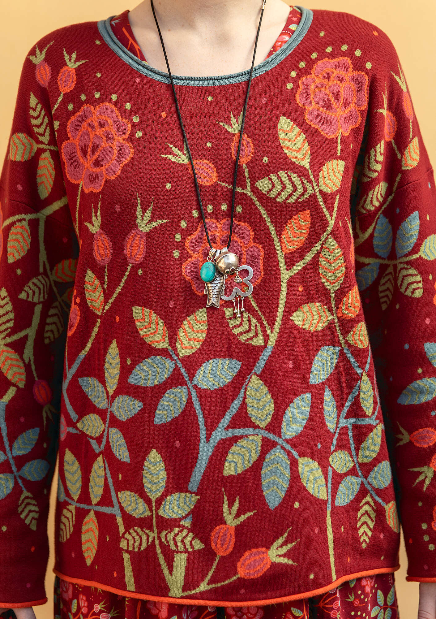 - Jacquard-knit sweater with a design of rose hips and meandering vines. Straight cut with a round neckline and full-length sleeves, finished with beautiful rolled edges.