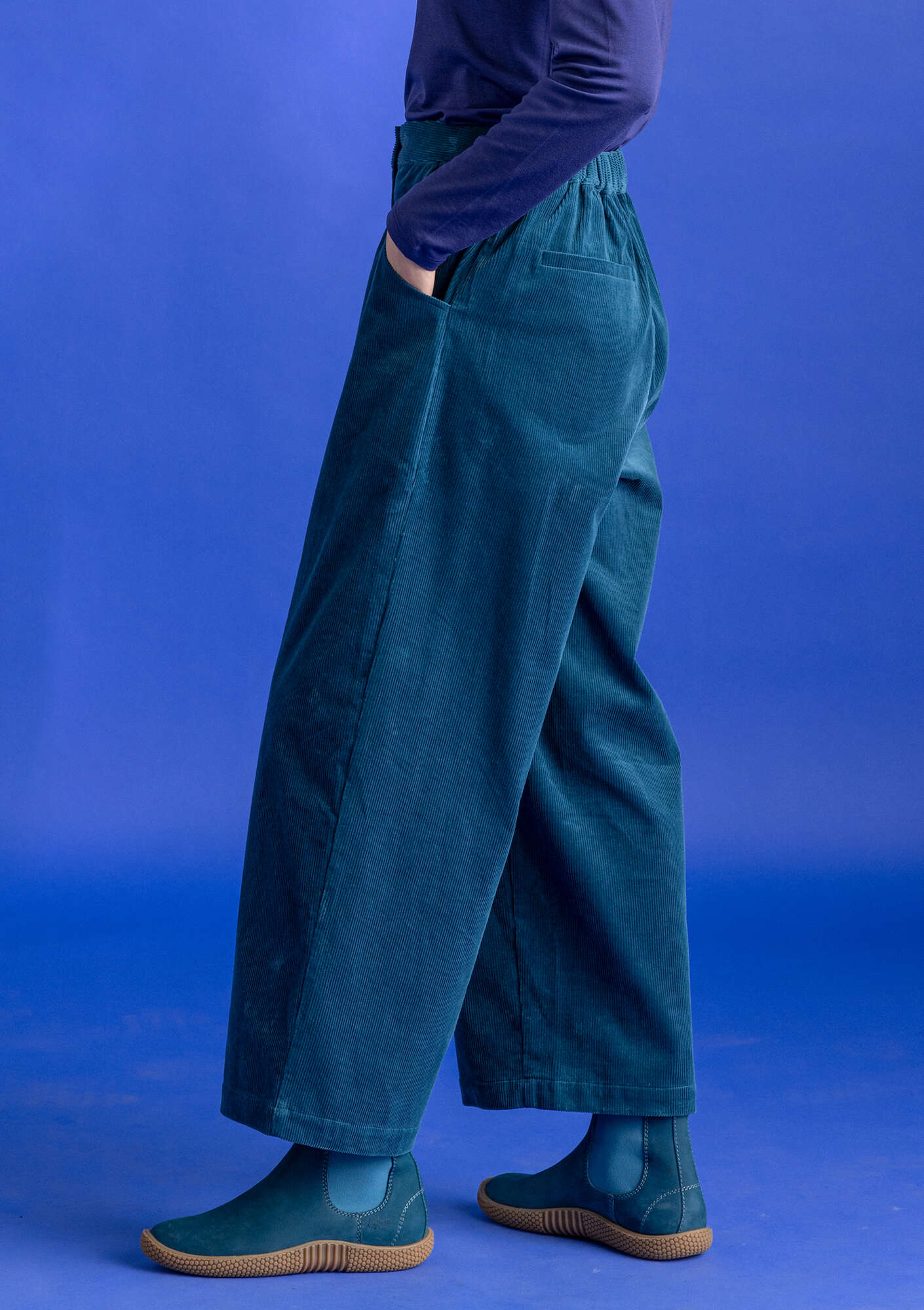 • Ankle-length style in soft corduroy. Now with a touch of elastane for an even better fit and longer wear. Side pockets and a back pocket. Button and fly. Elastication at the back of the waistband.