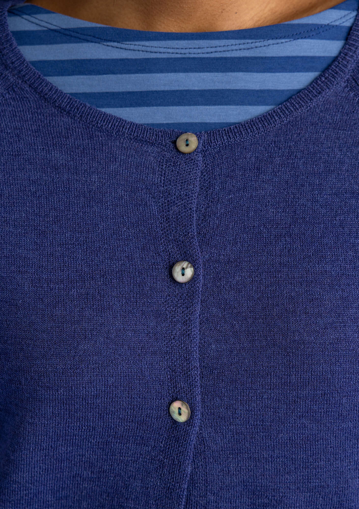 - Cropped style with full-length raglan sleeves. The neck, cuffs and hem are trimmed with a fine rib knit edging. Featuring a practical pocket and beautiful mother-of-pearl buttons.