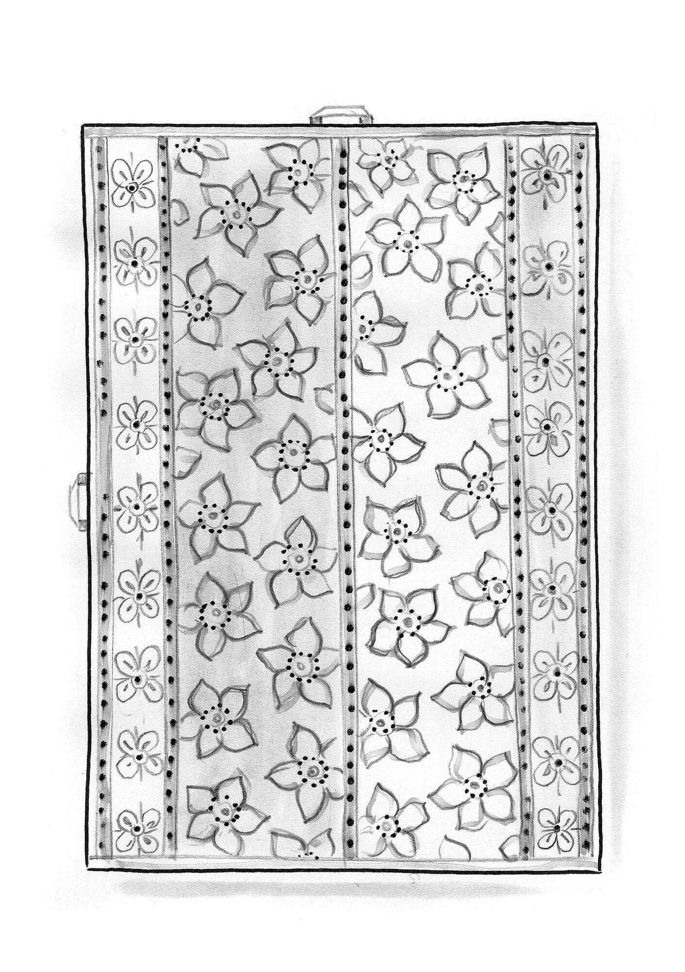 - Bath sheet with a floral and dot design. The edges and side loops are in a contrasting colour.