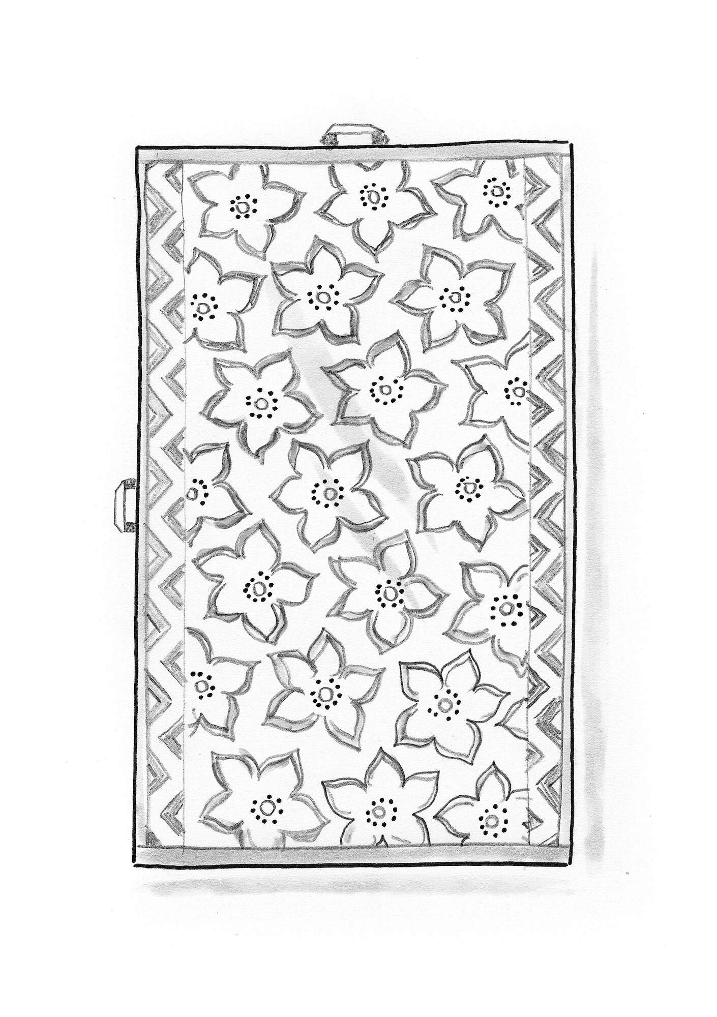 • Towel with a floral design and borders. The edges and side loops are in a contrasting colour.