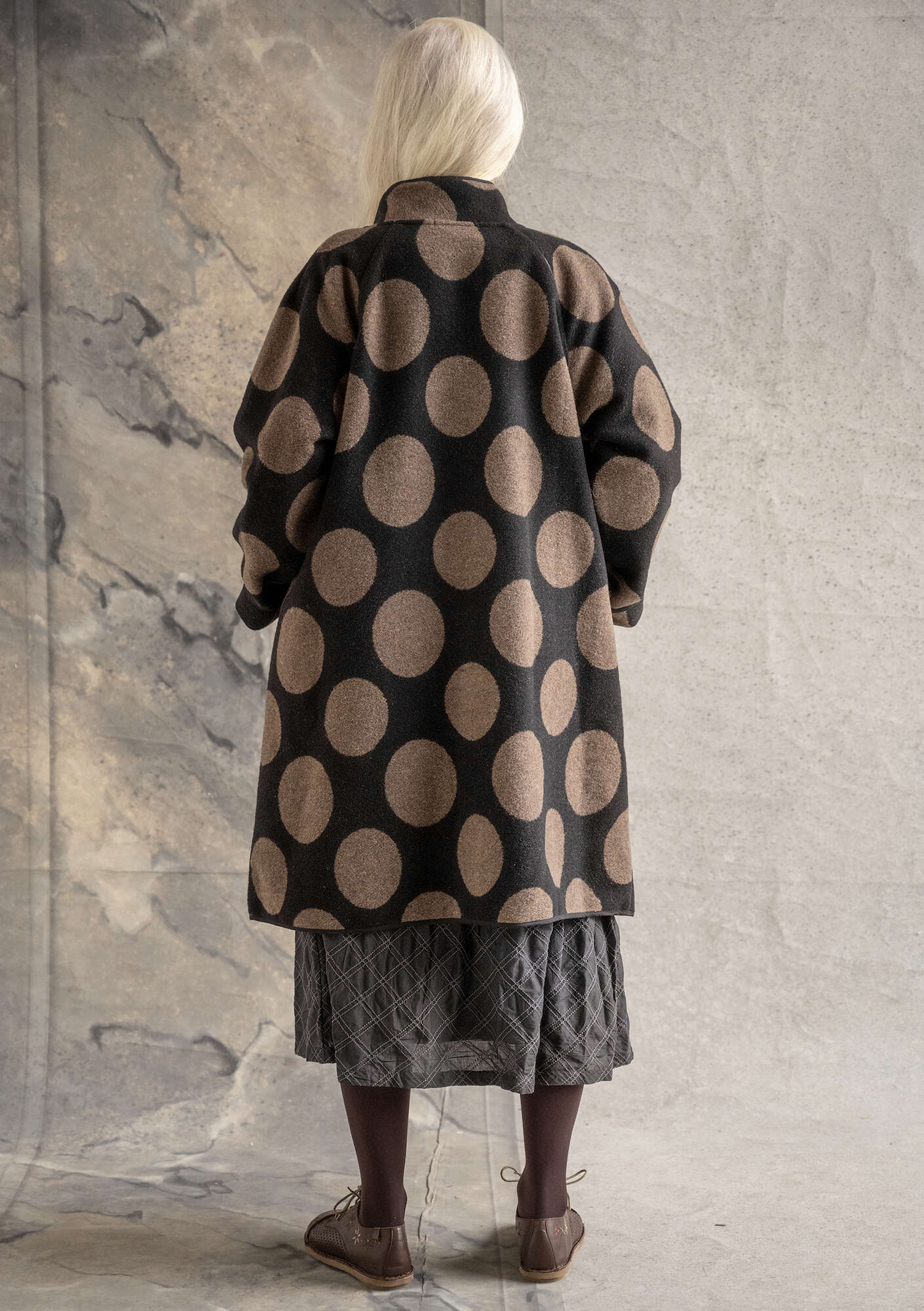 - Showcasing a delightful bold dot jacquard-woven pattern. Featuring ribbon edging, full-length, raglan sleeves, a tall collar and patch pockets. Coconut buttons in natural colours.