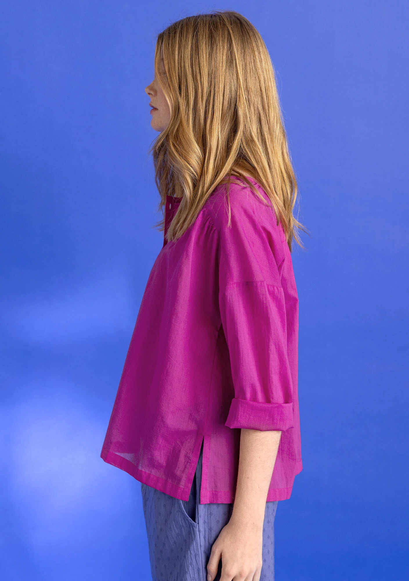 - Versatile blouse with drop shoulders and three-quarter sleeves. Yoke in front and back, where the fabric has a hint of gathering. It offers a beautiful detail and comfortable volume toward the hem. Decorated with lovely mother-of-pearl buttons.