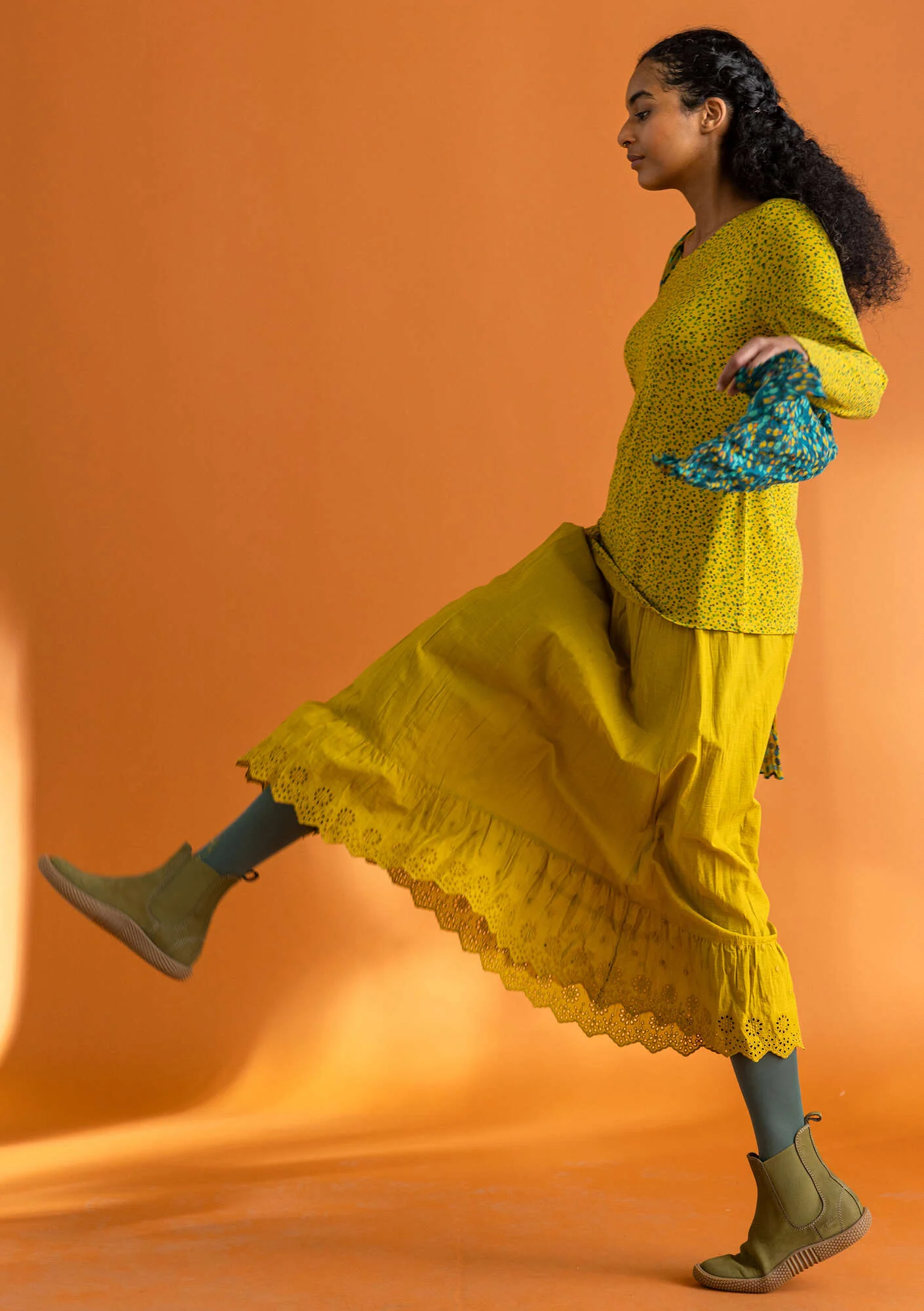 - A simple silhouette with an elastic waistband, embroidered dots and a broderie anglaise hem. Adjustable elastic by means of a small button, for personal fit.
