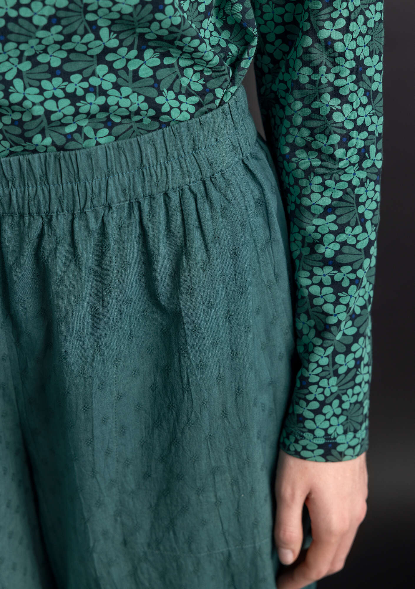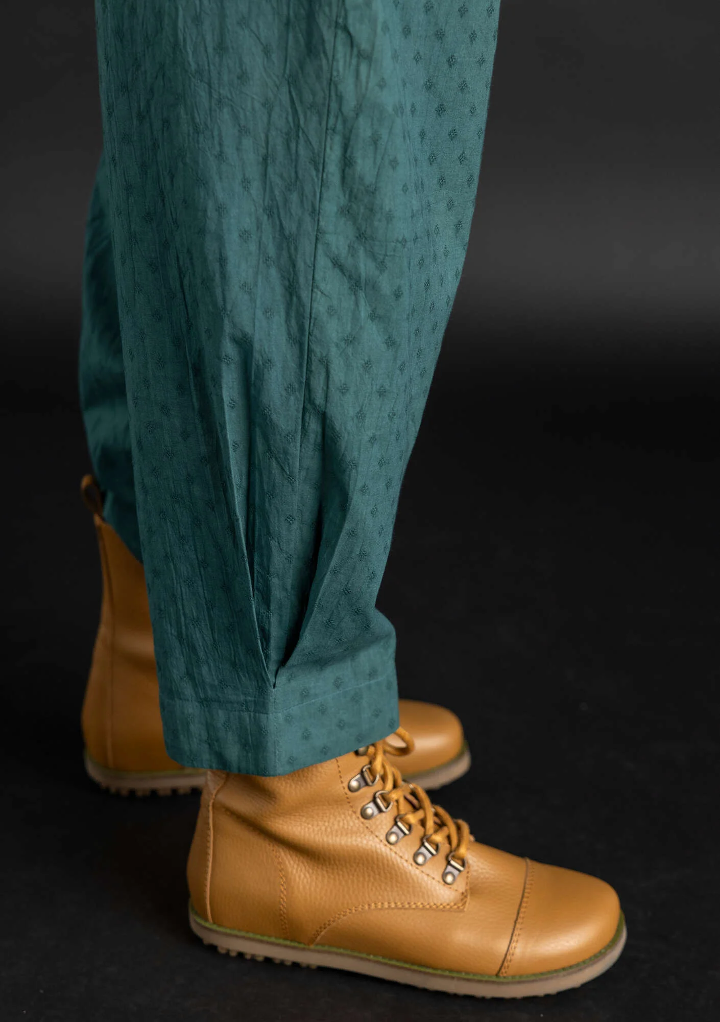 - Ankle-length pants. Made in a dobby fabric, which gives the solid-colored garment a textured pattern. Inverted pleats at the end of the leg create a subtle puff of volume. Side pockets and a comfortable elastic waist.