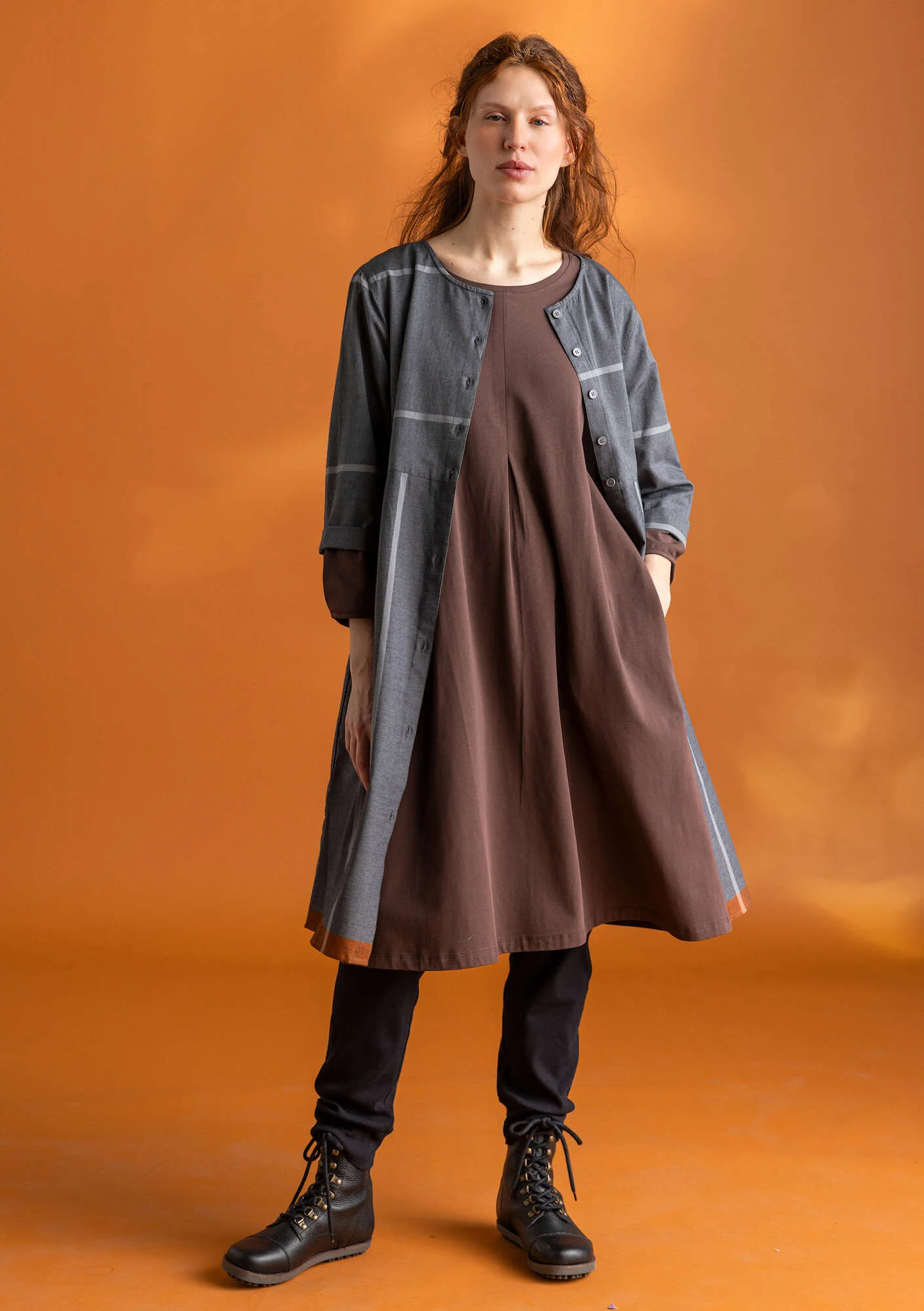 - A simple silhouette with a stitched-down front box pleat. A pleat gives the three-quarter sleeve an attractive shape. Available with our u201cYlvau201d design and in solid colours too. Side pockets.