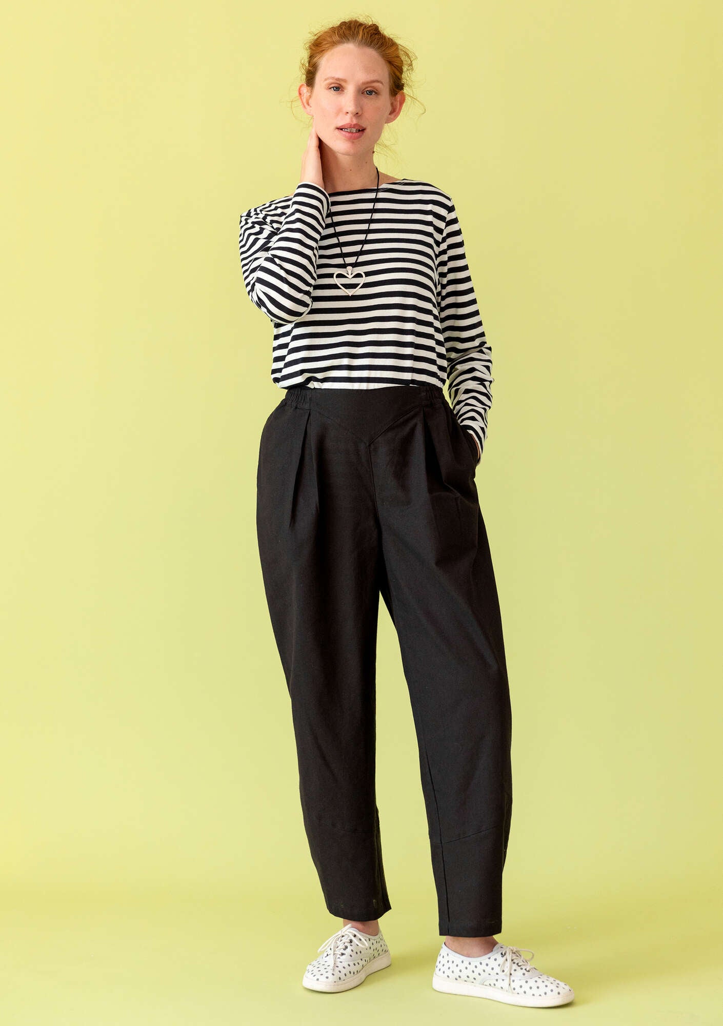• Ankle length and crafted from a soft, breathable fabric. Elasticated waistband and a V-shaped yoke at the waist. Two front box pleats and side pockets. Attractive stitching detail at the hem creates a curved look.