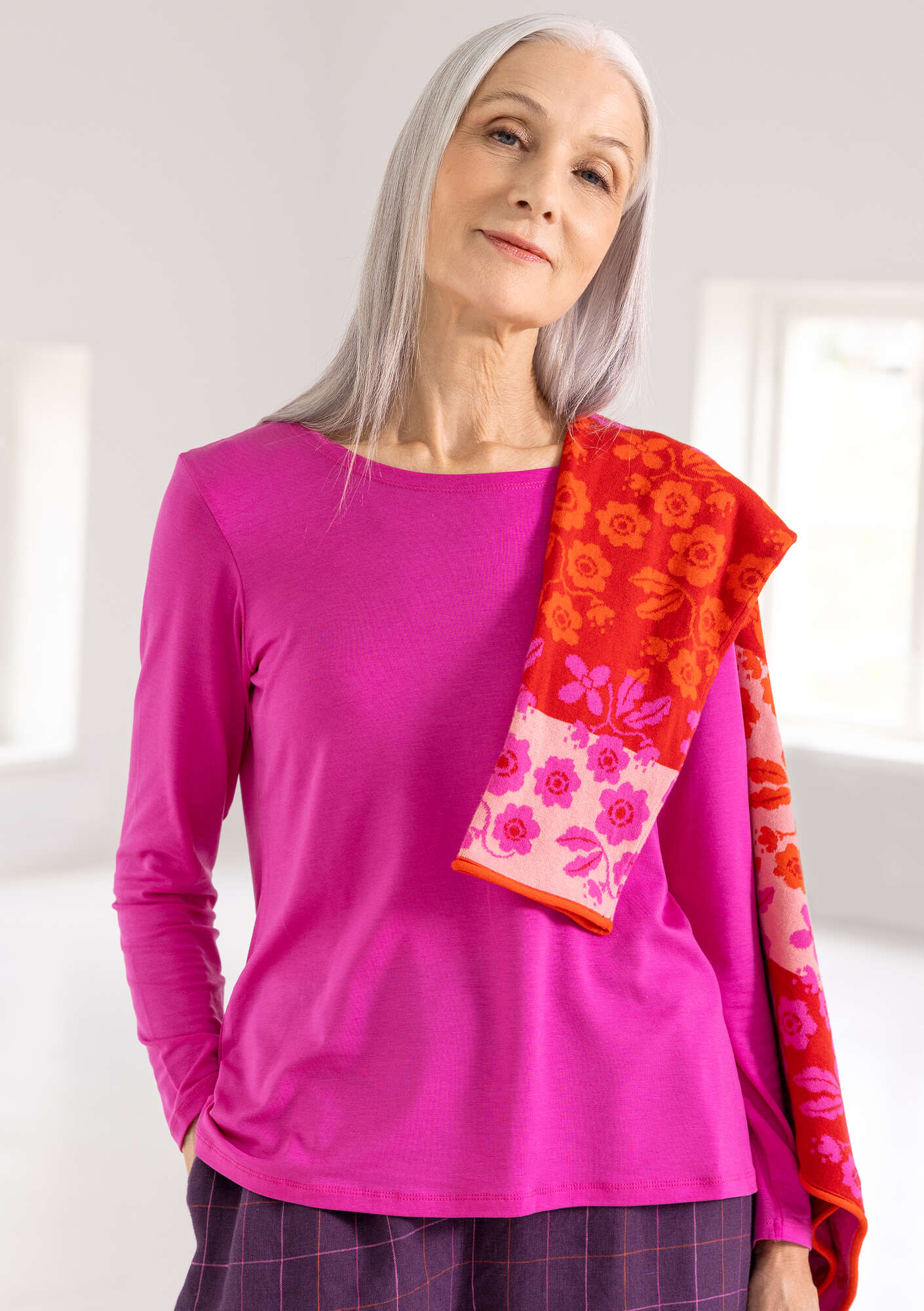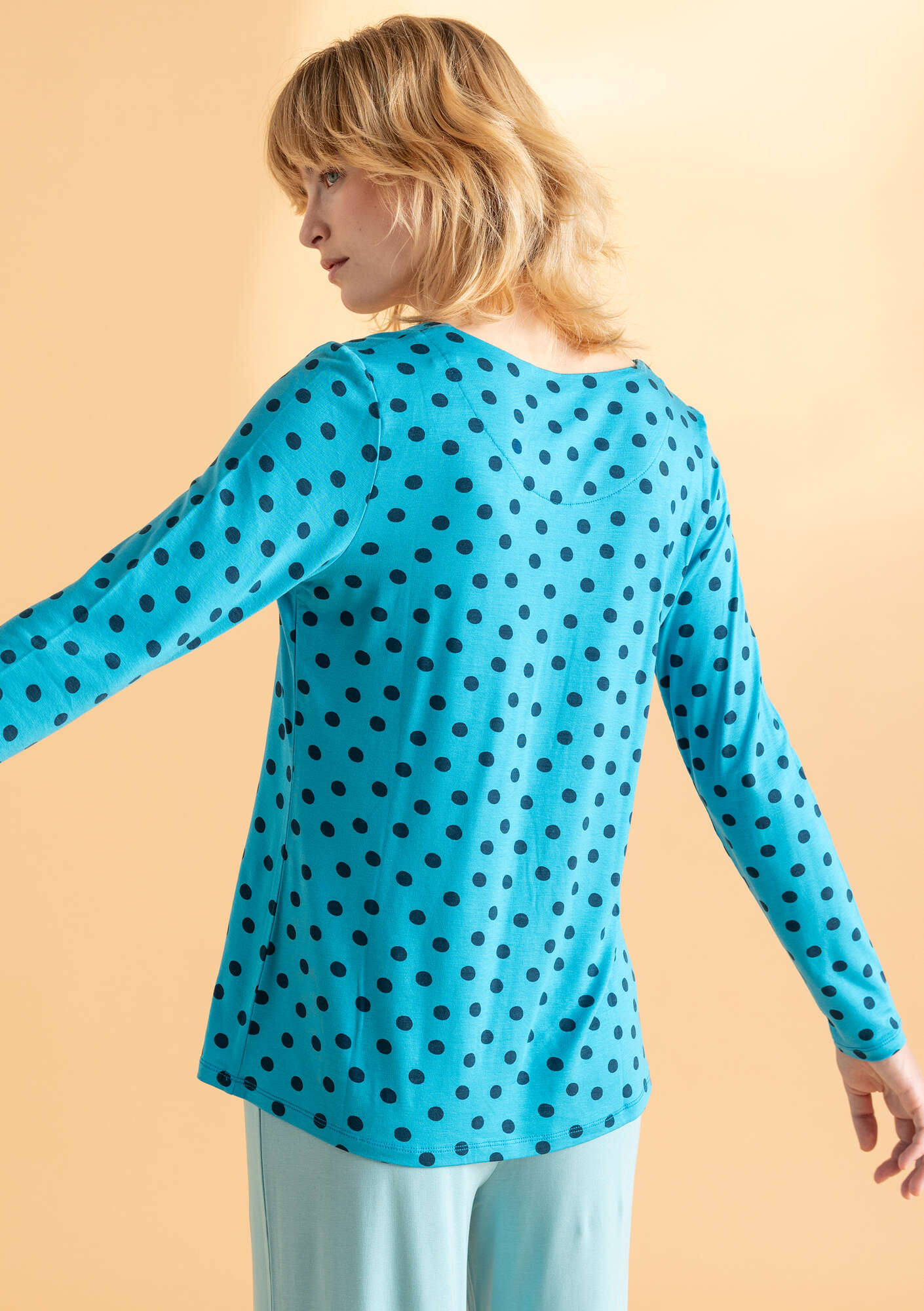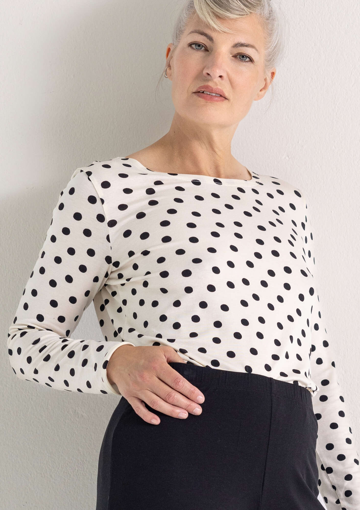 • Simple, slip-on and go style. Round neckline and full-length sleeves. Available in solid colours and with a dot print.