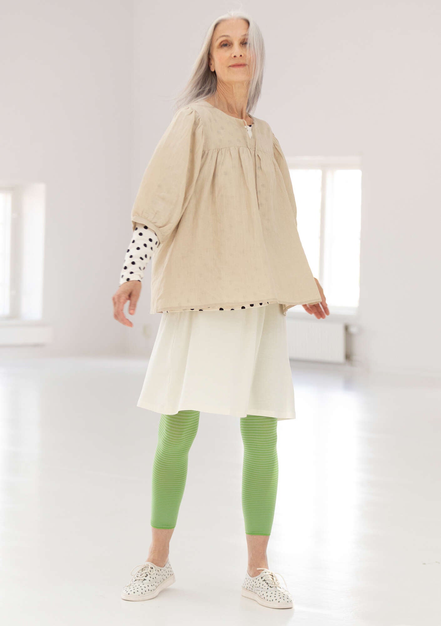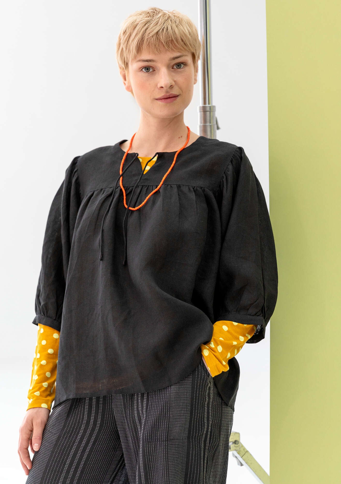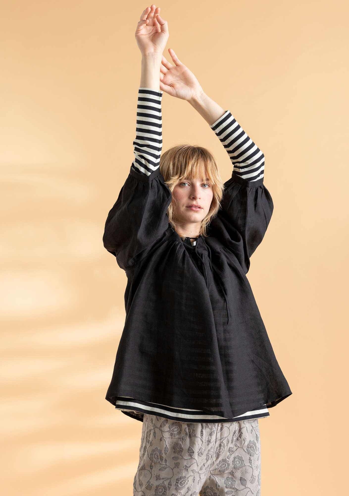 Whimsical style with a generous fit. Yoke with front slit and tie. Puff sleeves that hit just below the elbow. Comes in solid colours and with a yarn-dyed check print.