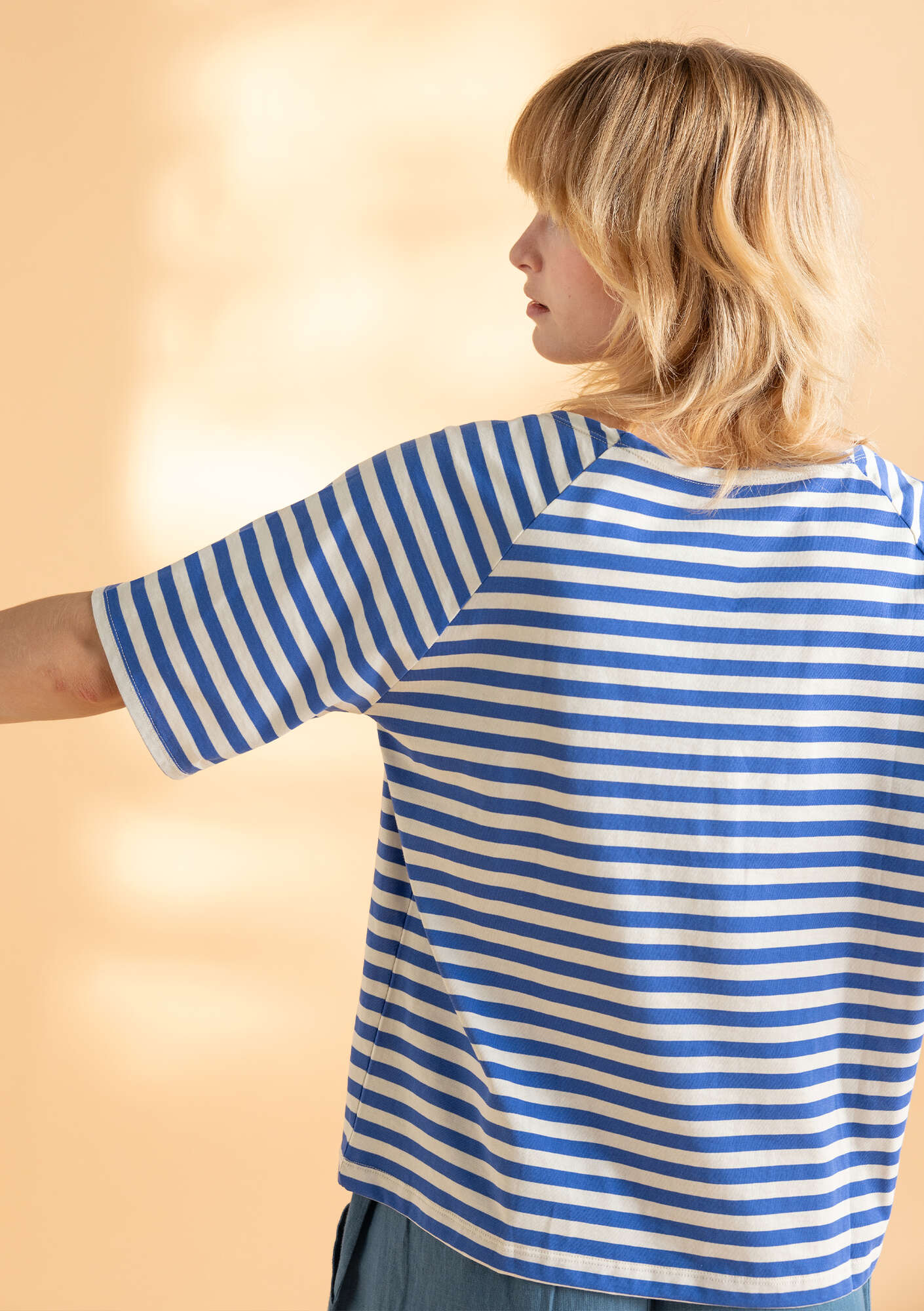 A cropped top with an airy fit. Featuring a gentle boat neck and longline raglan sleeves. The top has a relaxed silhouette and strikingly positioned stripes.