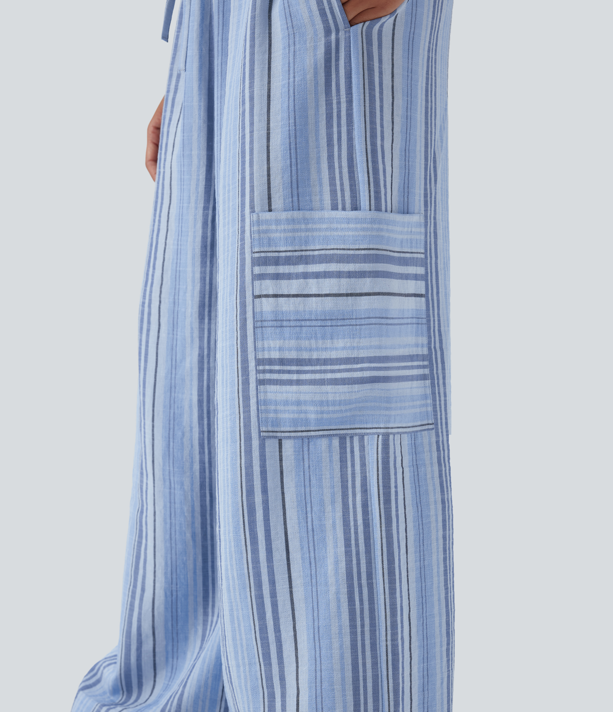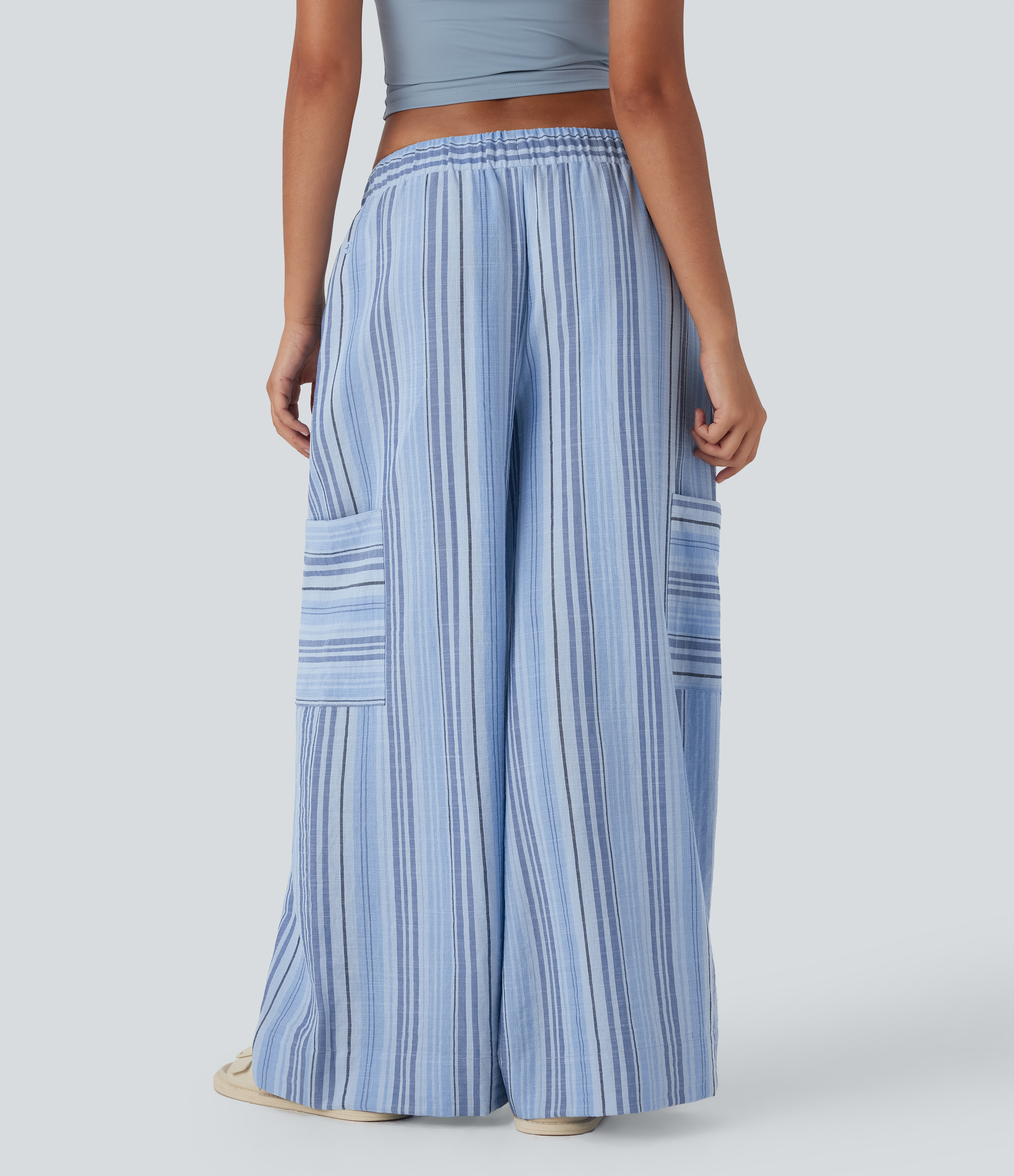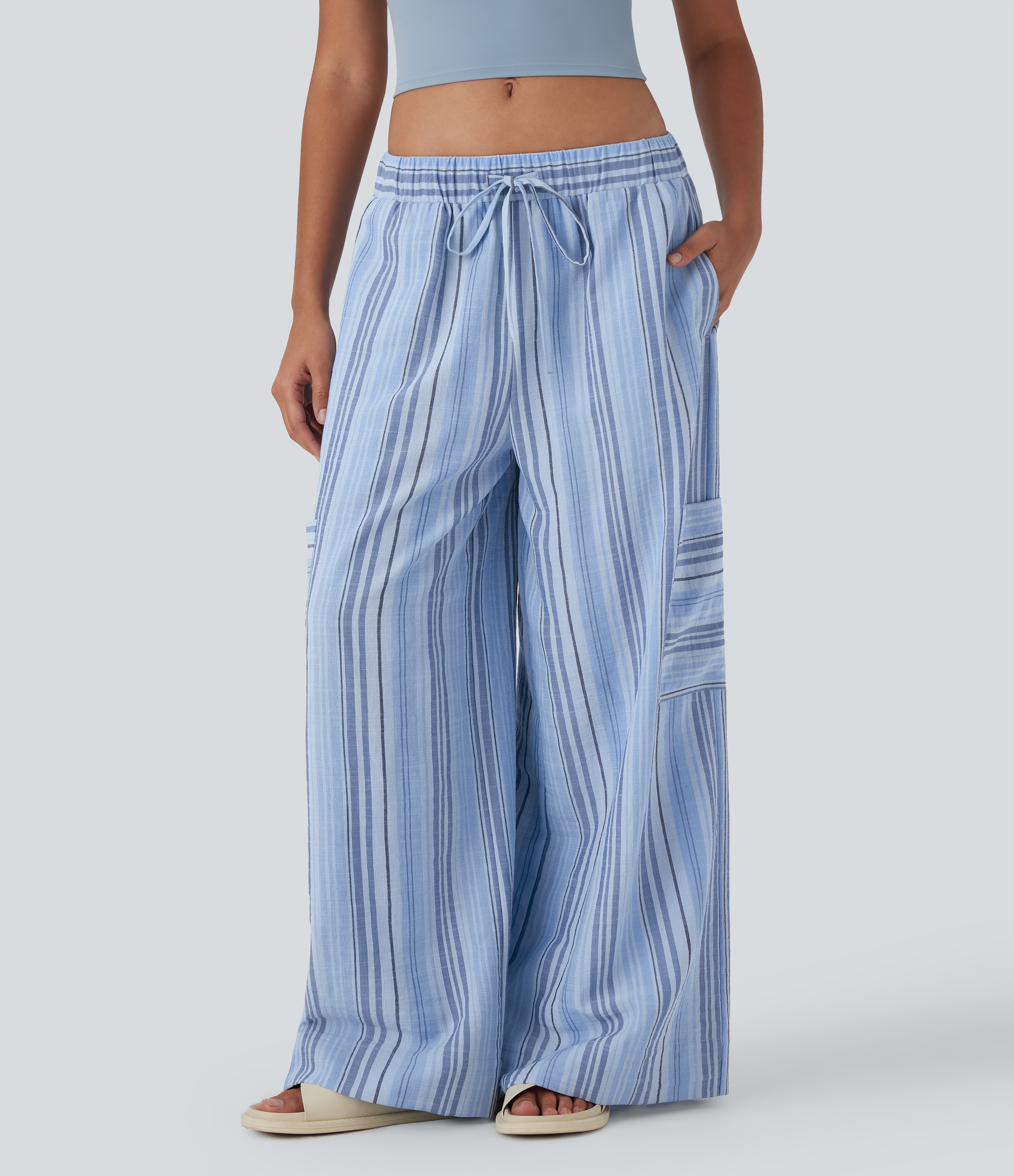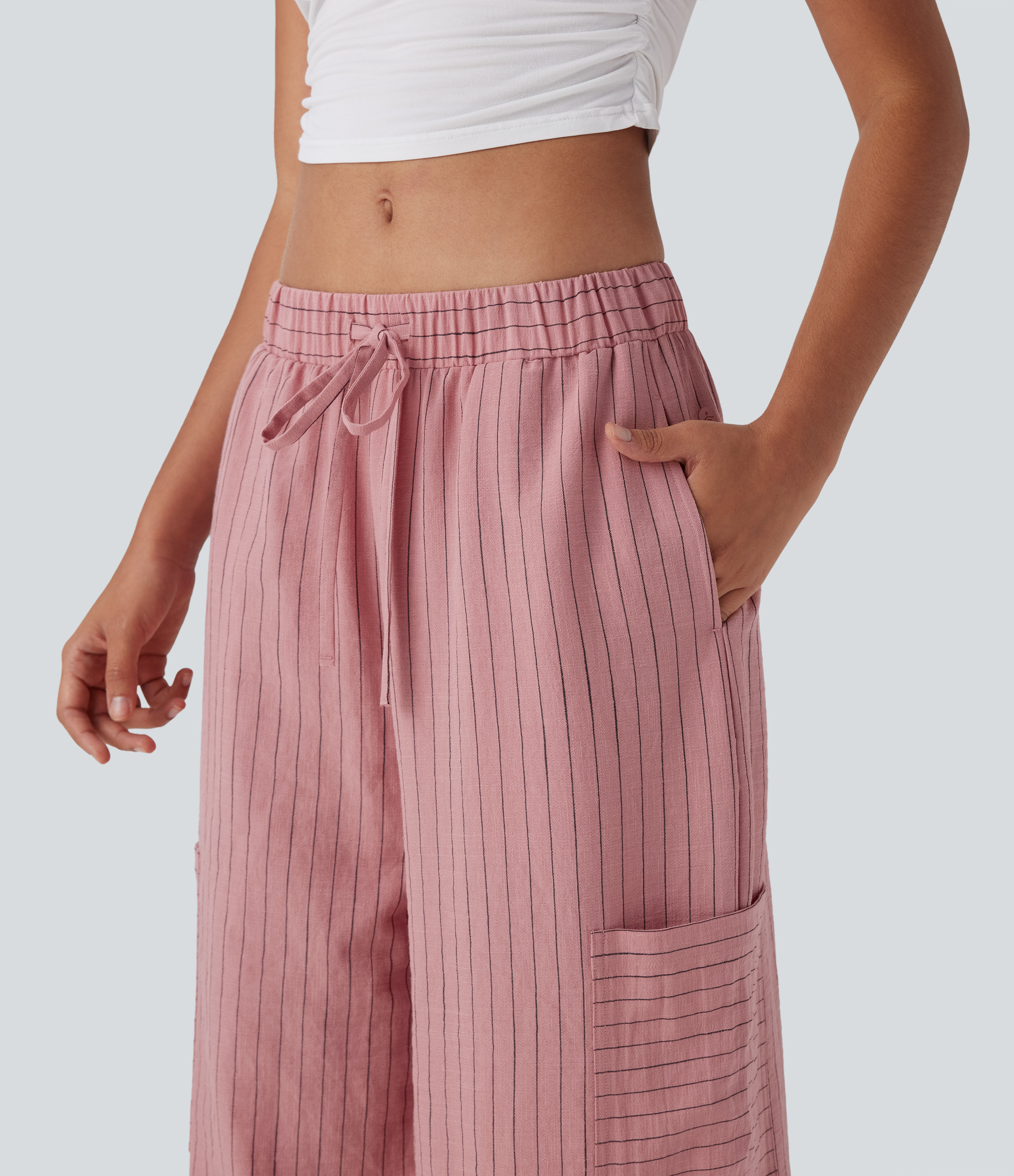 Low Rise Drawstring Wide Leg Stripe Casual Linen-Feel Pants with Pockets