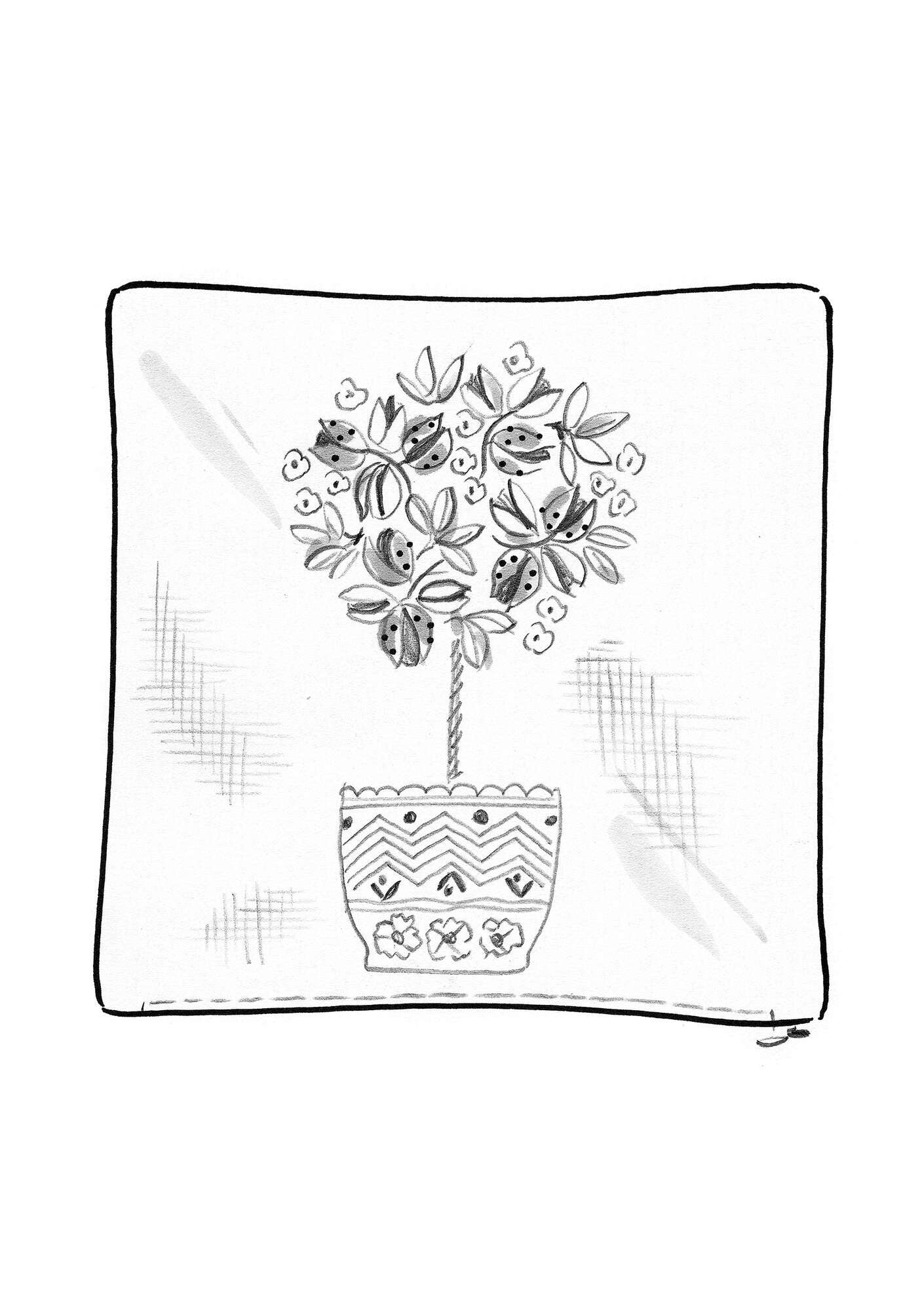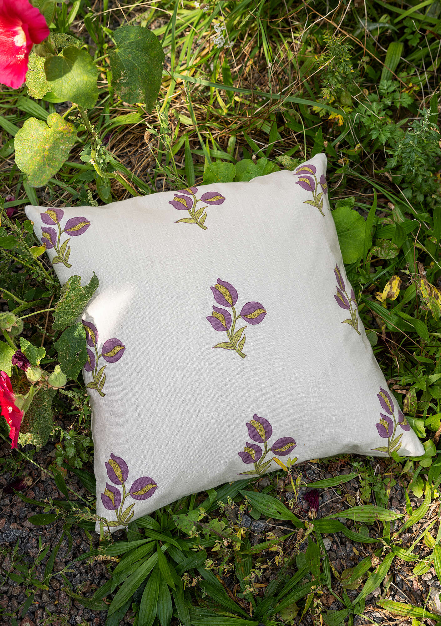 An exquisitely crafted cushion cover featuring a delicately embroidered lemon tree motif. It has a block print design on the reverse. Square shape with a concealed zip along the bottom seam.