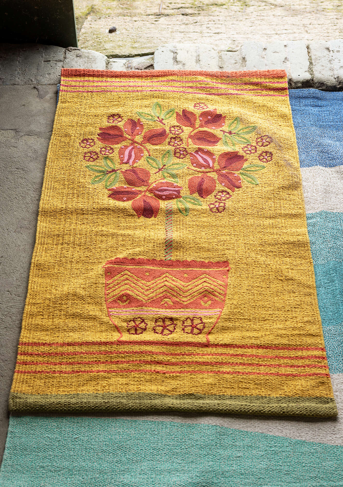 The striking lemon tree design embroidered in the middle of our rectangular mat is framed by narrow, woven stripes at the ends.