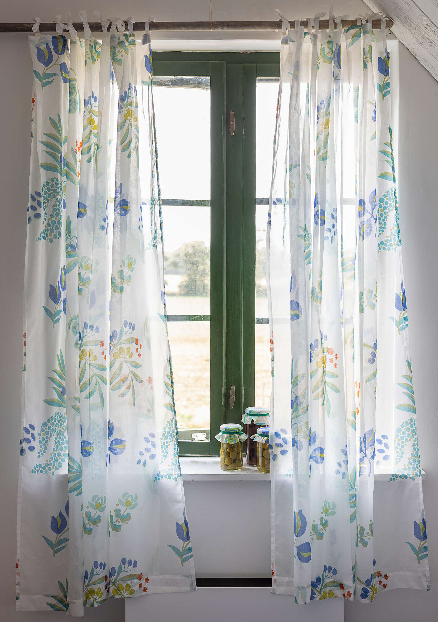• Half-length curtain made of a delicately transparent, breezy organic cotton voile printed with our “Olives” design. Pretty ribbon ties at the top to hang the curtain on the rod. Sold individually.