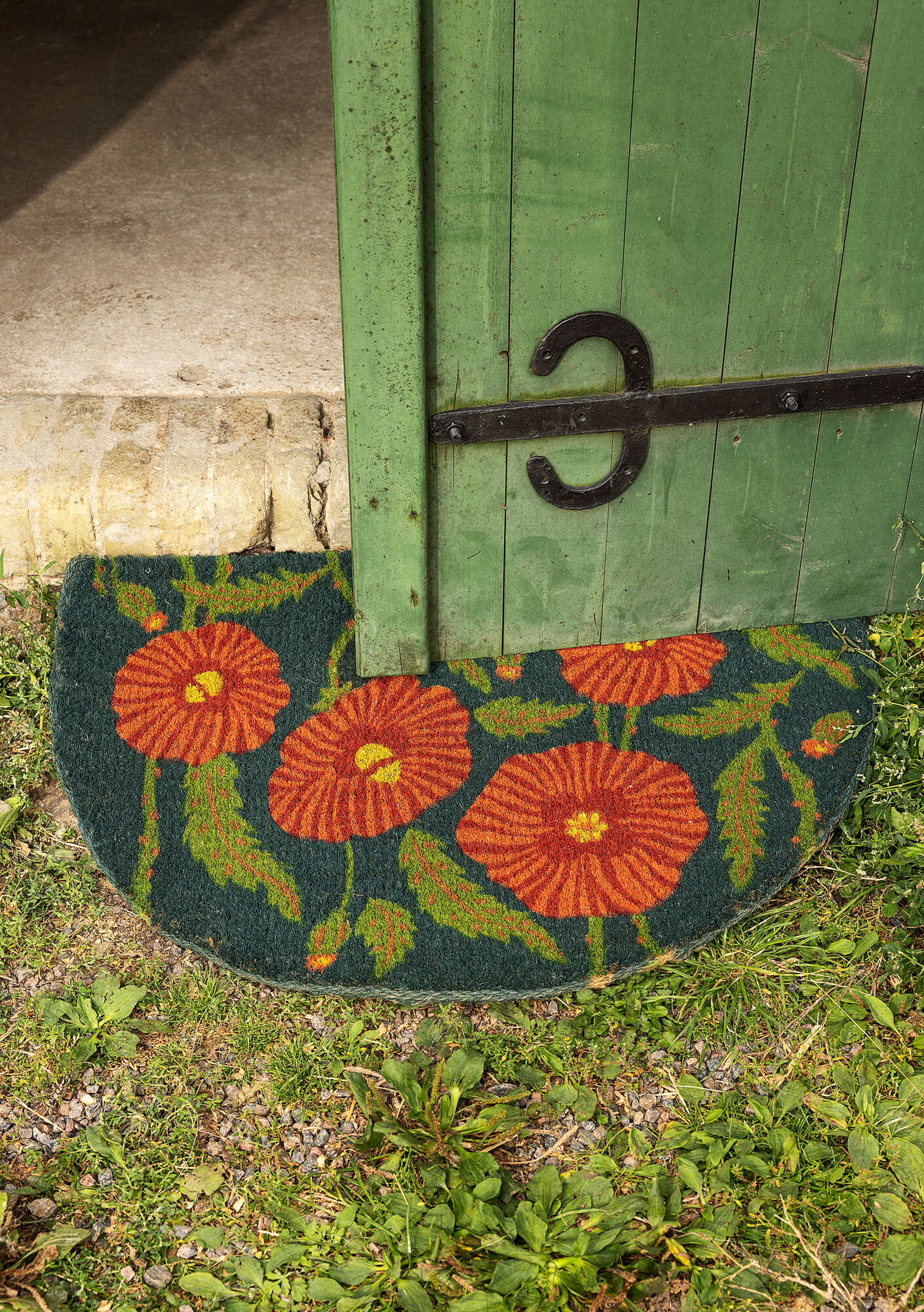 Semi-circular doormat featuring a design of poppies screen-printed on a robust material with rugged coir bristles to scrape off grit and moisture.