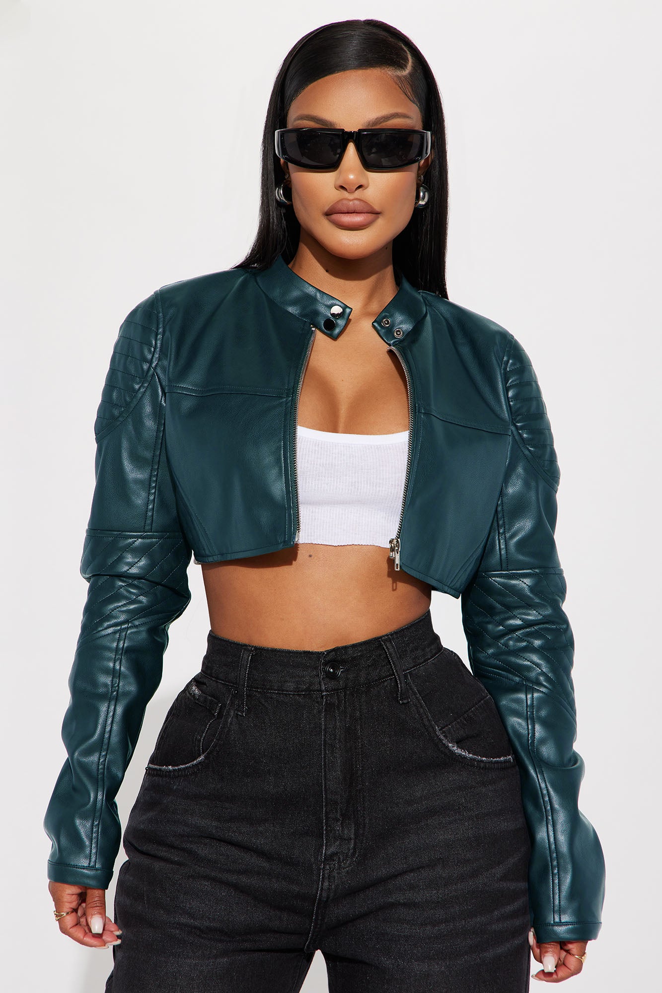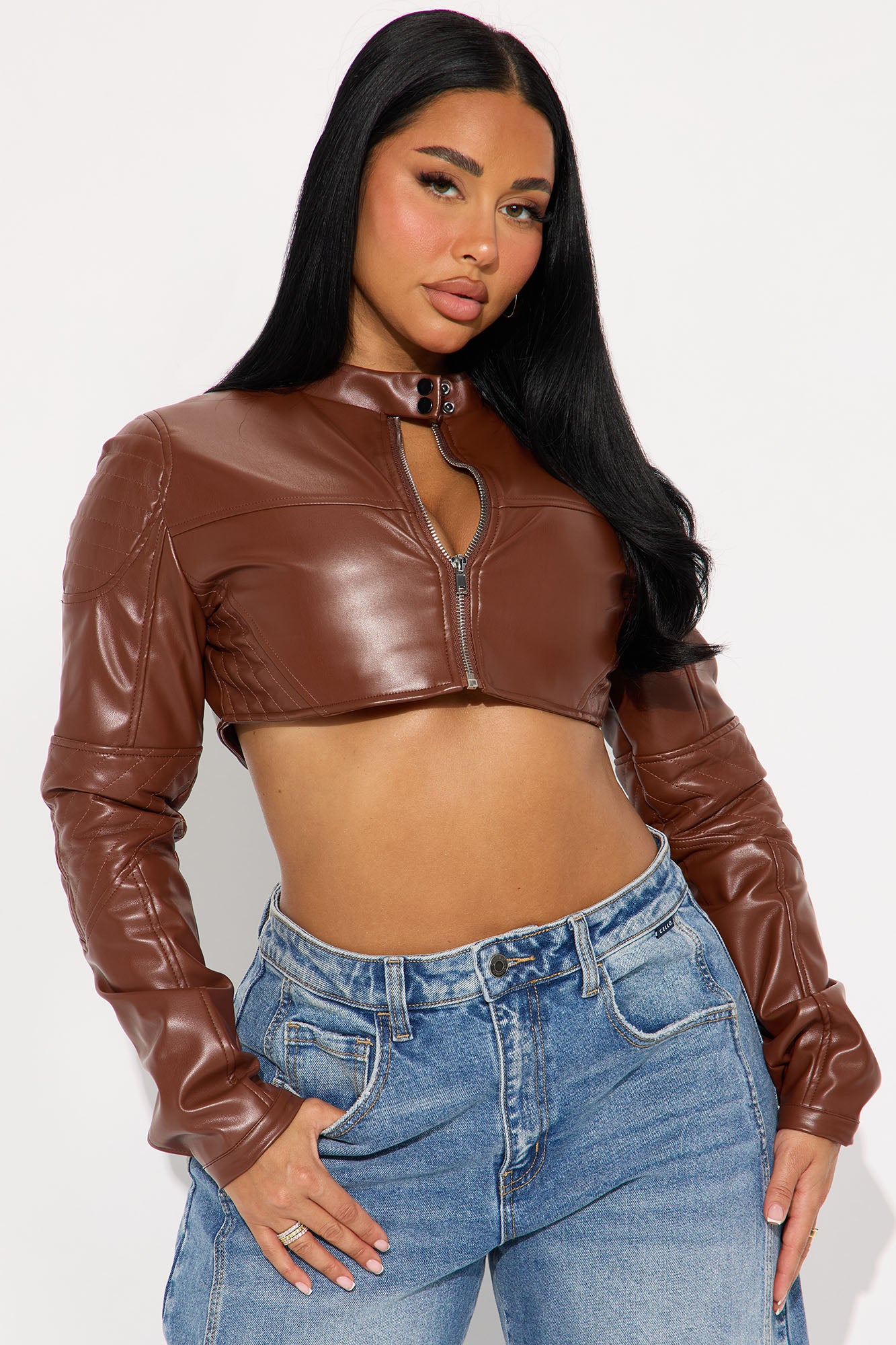 Available In Black, Burgundy, Chocolate, Olive, Red, Royal And Turquoise.Faux Leather JacketMock NeckButton ClosureFull ZipLong SleeveCroppedLinedShell: 100% Polyester Coated With PULining: 100% PolyesterImported