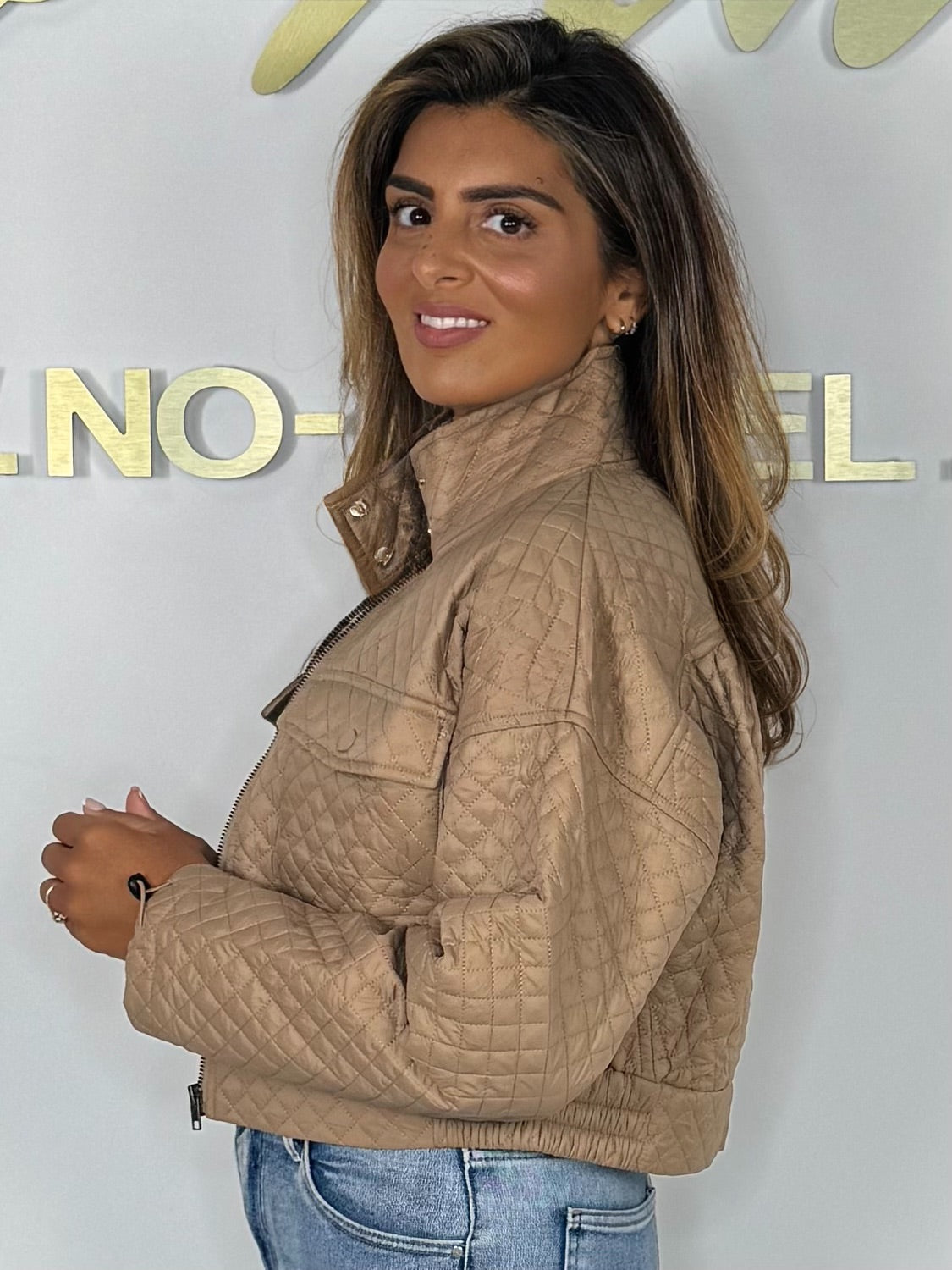 Camel High Neck Quilted Cropped Pocket Jacket