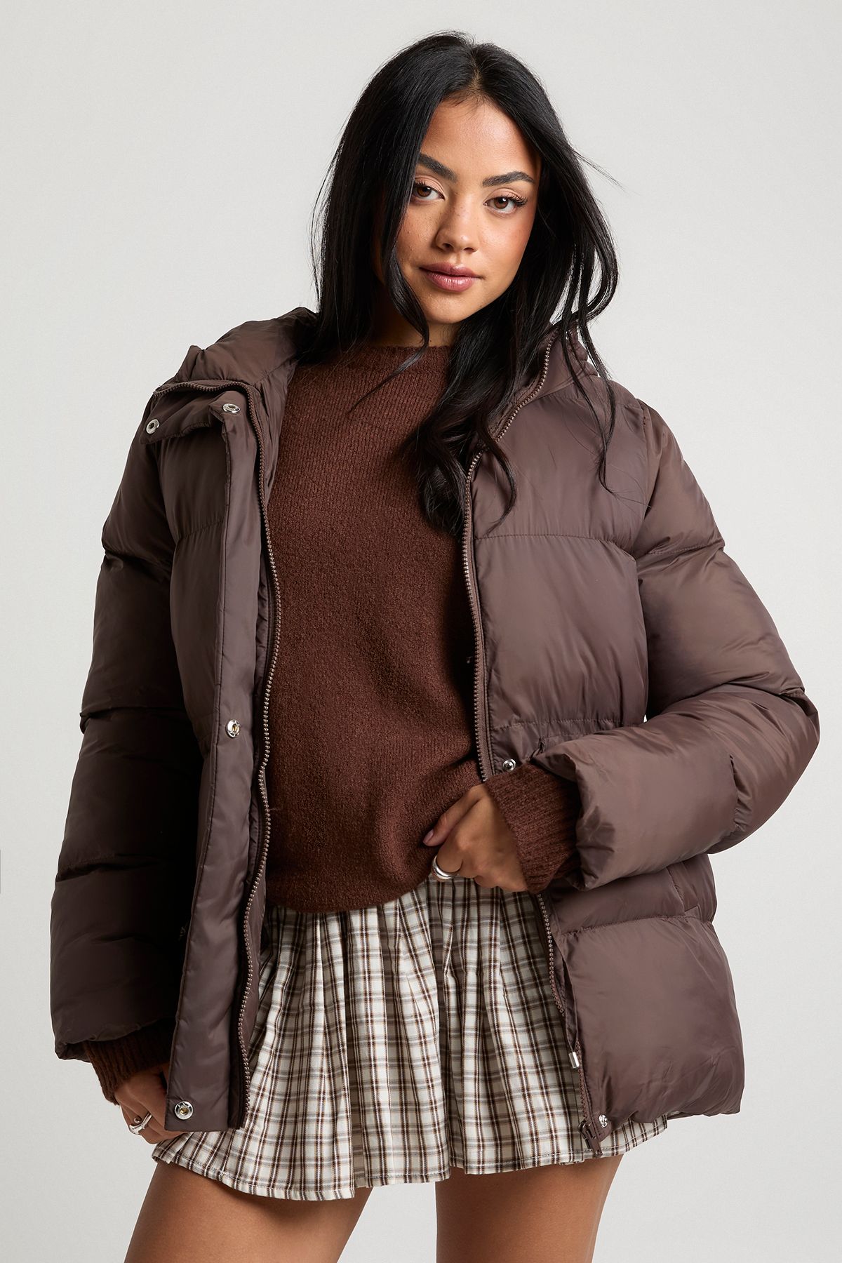 - Side pockets to keep your essentials secure and hands warm This Cinch Waist Hooded Puffer Jacket is the ultimate cold-weather companion that doesn't compromise on style. The adjustable cinched waist allows you to create different looks - wear it loose for a relaxed, oversized feel or tighten for a more defined shape. Style it casually as shown with a cosy jumper and pleated mini skirt for a trendy daytime look, or pair with straight-leg jeans and chunky trainers for weekend coffee runs. The practical hood and substantial padding make this jacket ideal for casual outings, family gatherings, and everyday errands. Perfect for layering over knitwear during the autumn months or with a thicker jumper when temperatures really drop, this versatile puffer will quickly become your go-to outerwear option for staying fashionably snug throughout the season.