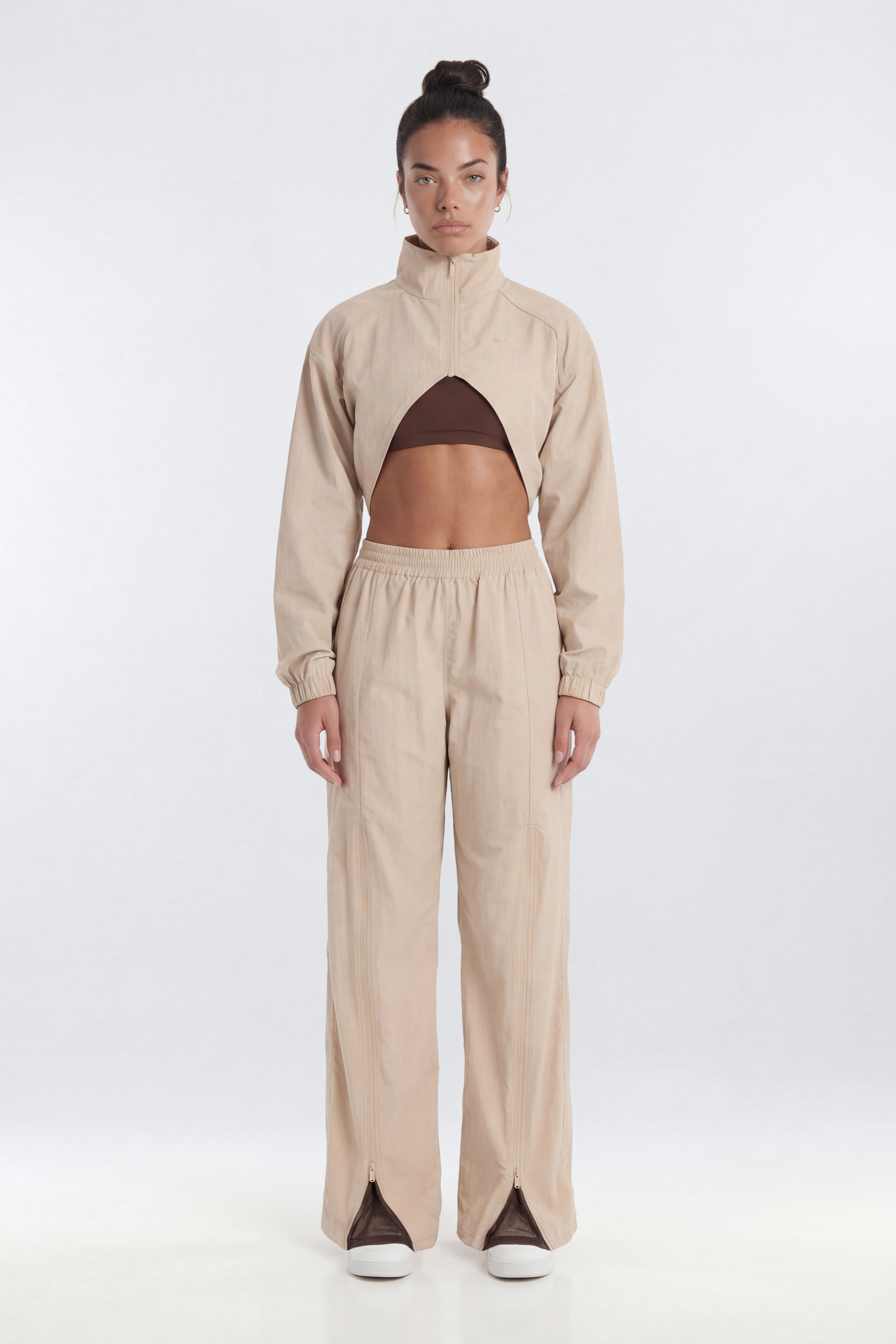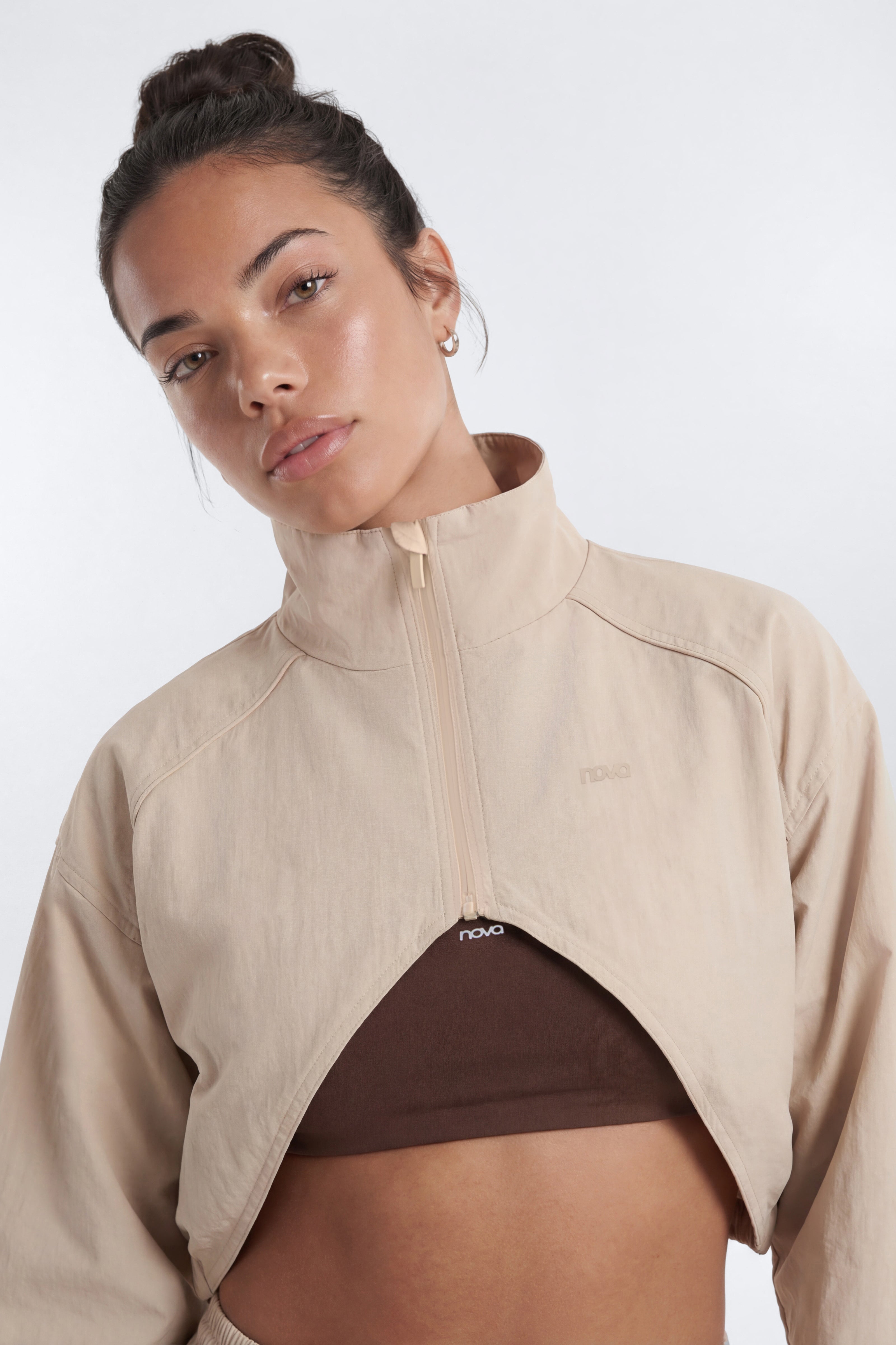 Available In Blue And Taupe.NylonContrast Godet DetailFront ZipMock NeckCroppedSelf: 100% NylonLining: 100% PolyesterImportedAvailable In Plus Sizes
