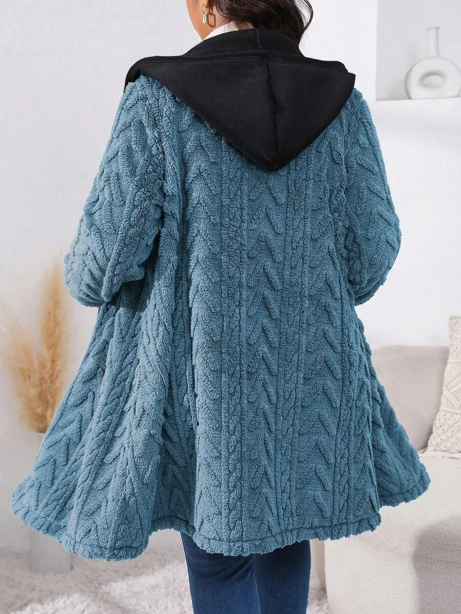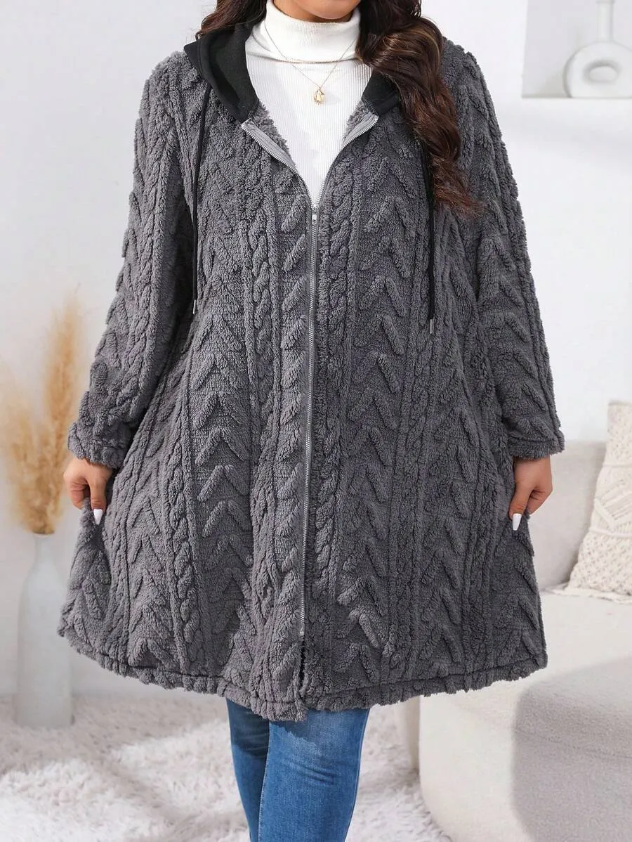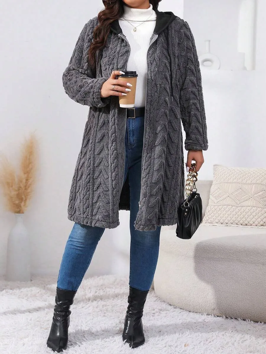 • Plus Size Women's Coral Fleece Hooded Jacket, Casual Fall Winter Zipper Coat, Warm Long Sleeve Outerwear for Ladies