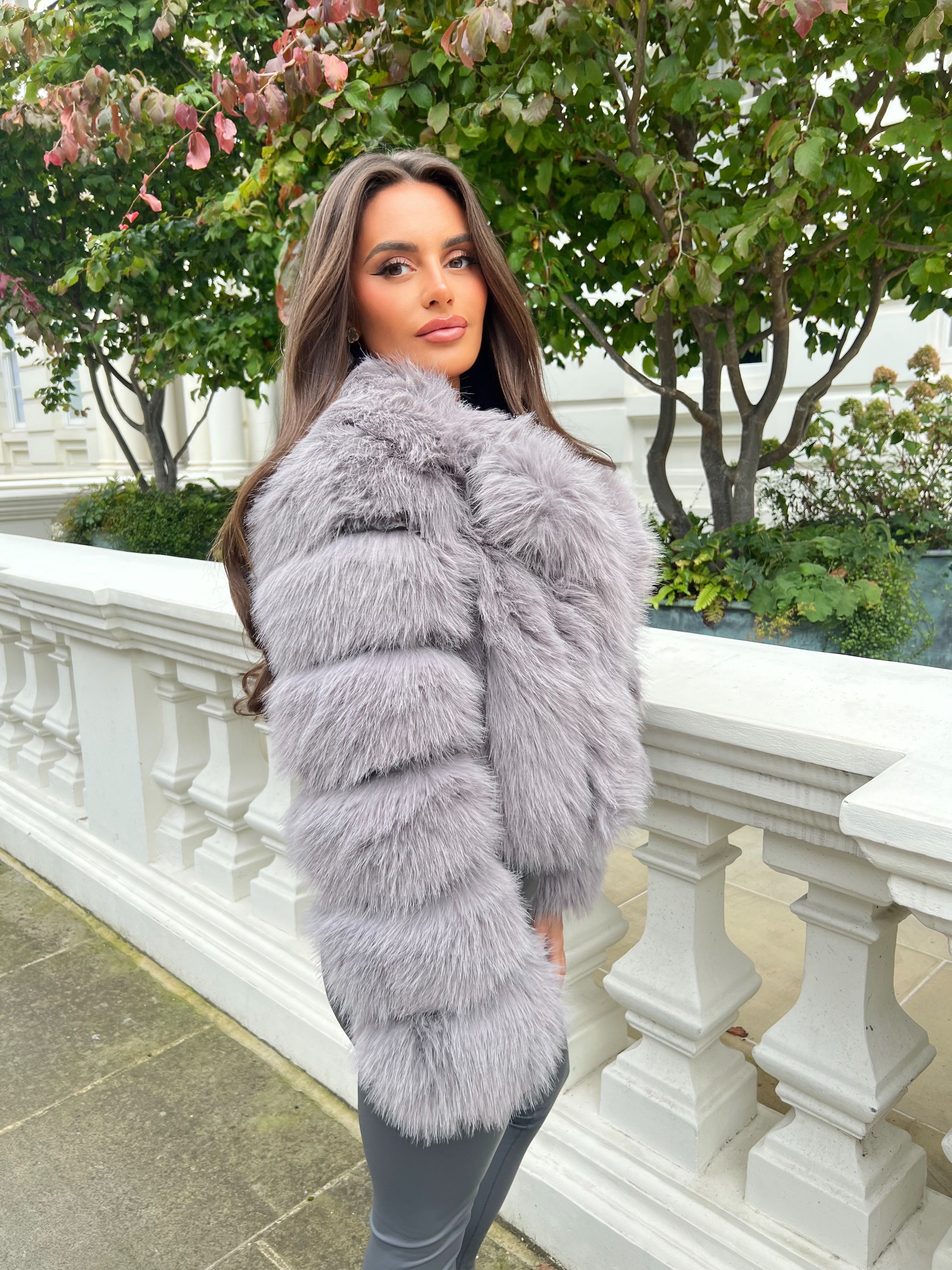 Expertly crafted with soft, faux fur, this jacket features a vertical design that flatters any figure. The collared neckline adds a touch of sophistication while the long sleeves provide warmth and style. With a convenient hook and eye fastening, this jacket is the perfect addition to any winter wardrobe.