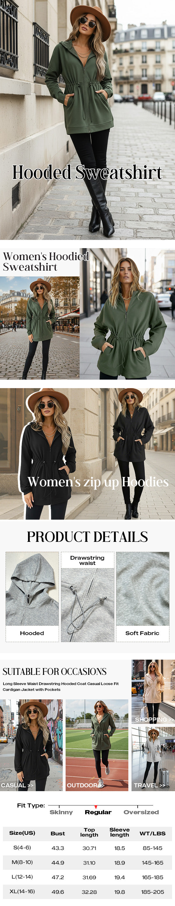 Design Details: Adjustable waist drawstring allows personalized shaping from relaxed to cinched; full front zipper closure ensures easy on and off; practical side pockets and hood enhance both utility and casual style.